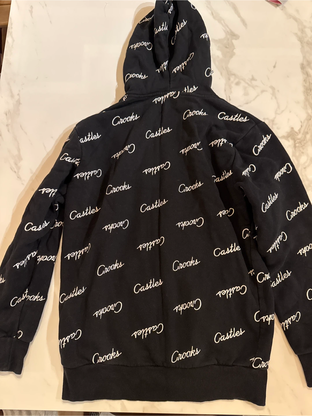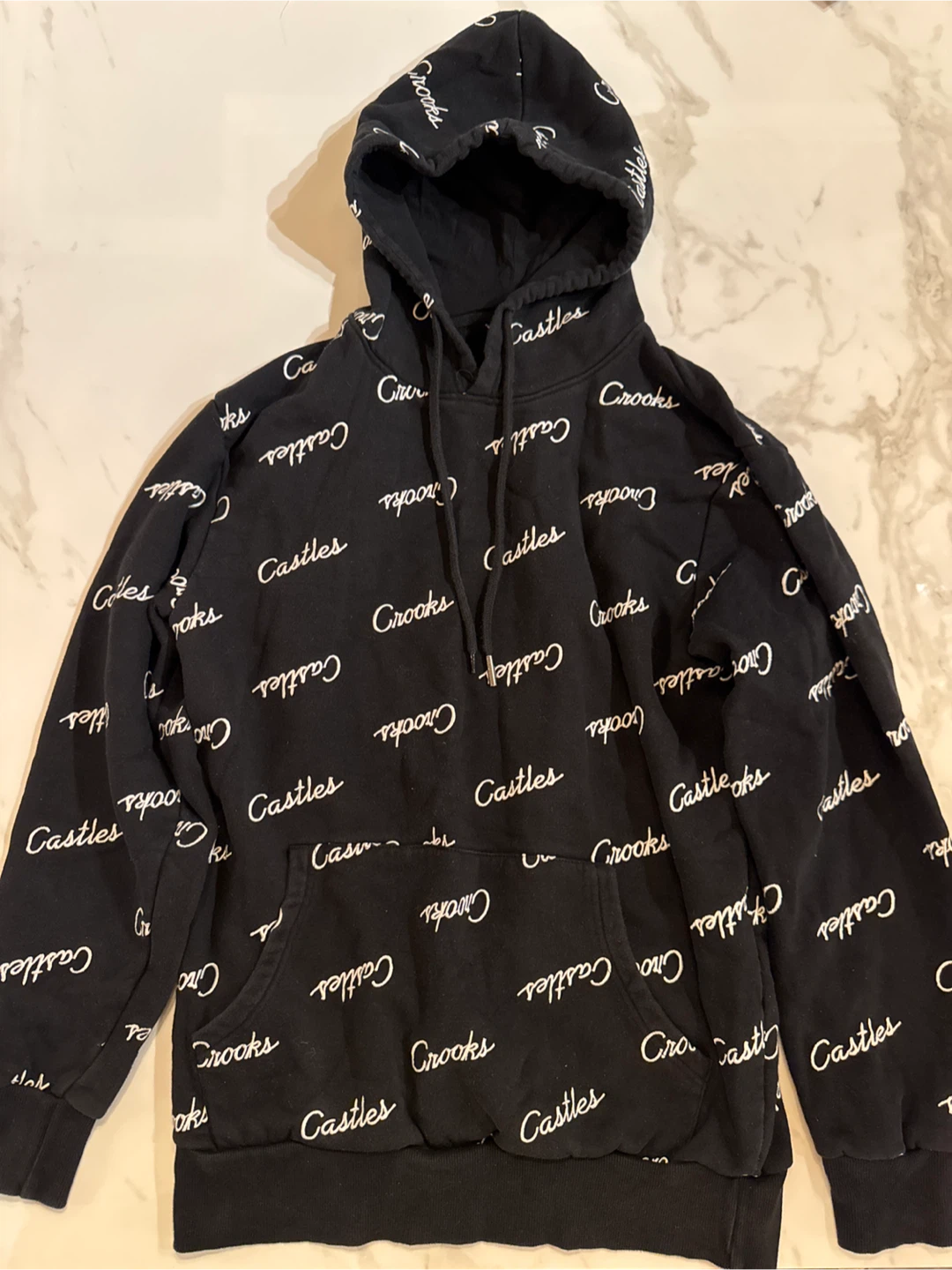 Selling a Crooks & Castles hoodie in black. It features the brand's name all over in a stylish pattern. The size is L/G.