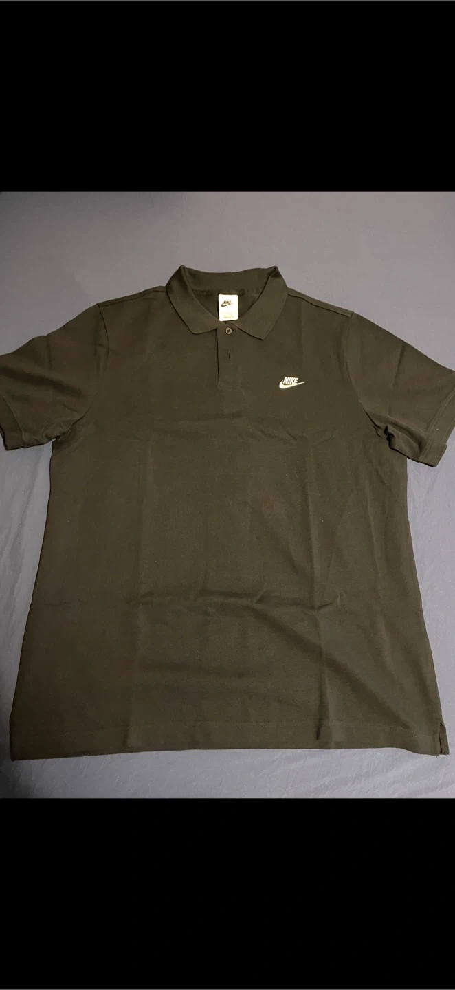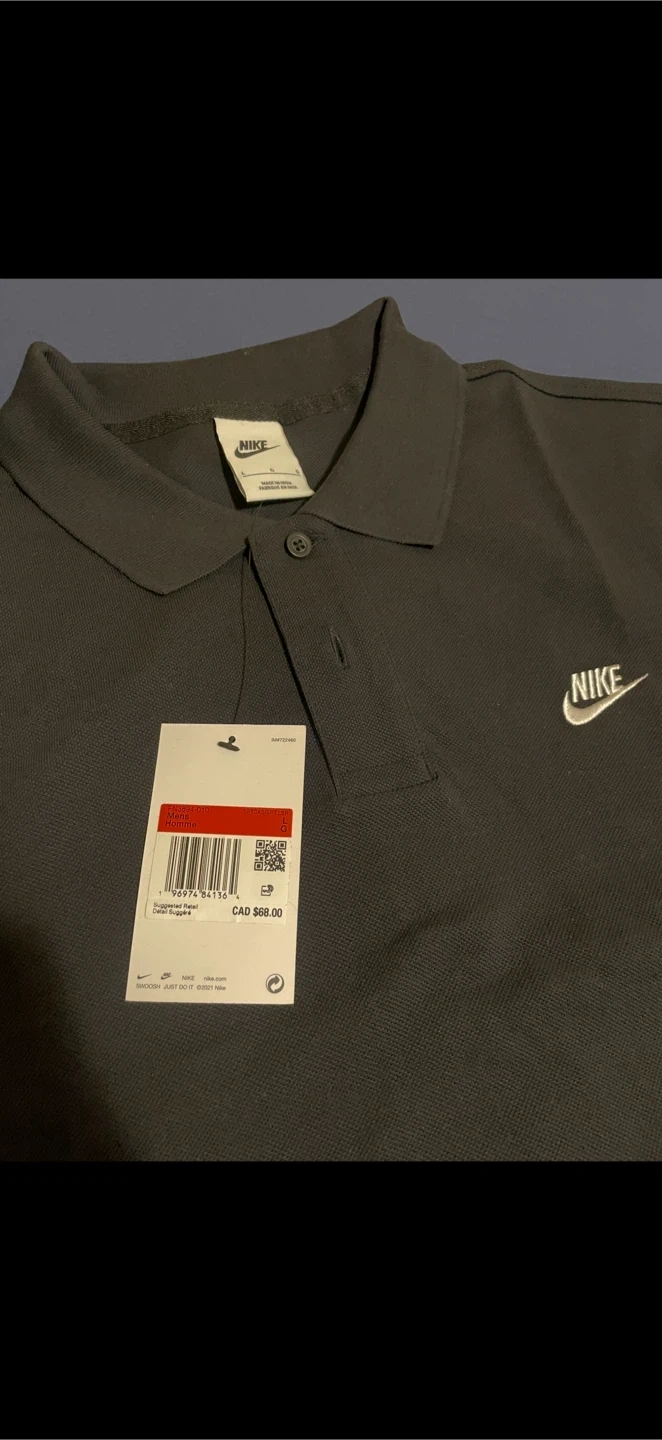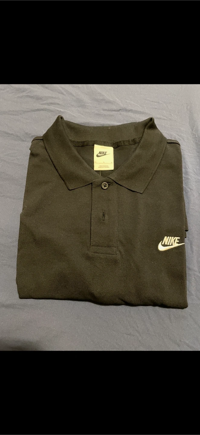 This is a Nike men's short-sleeve polo shirt in black. It features the classic Nike logo embroidered on the chest. The shirt is size large mens, and made of a comfortable cotton blend. It's great for casual wear or athletic activities!