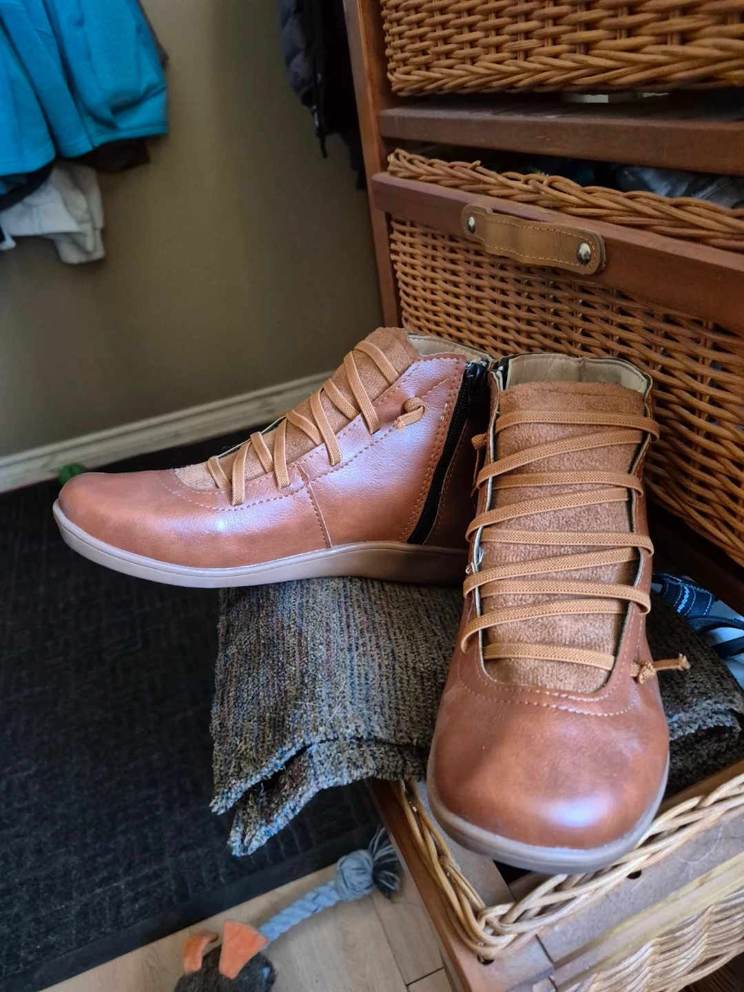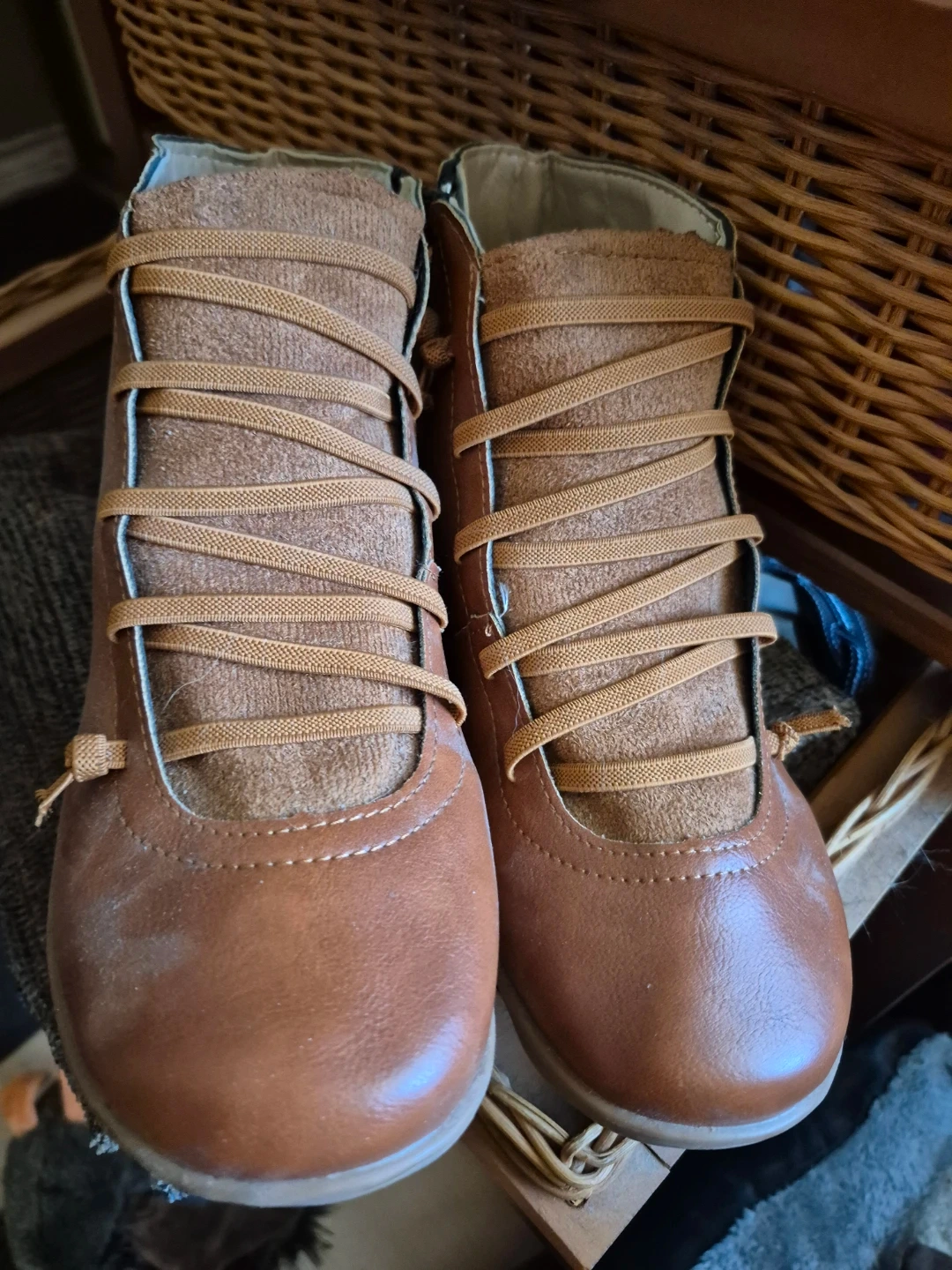 These brown ankle boots are a stylish and practical addition to any wardrobe. They feature a comfortable design with both laces and a side zipper for easy wear. The rich brown colour pairs well with many outfits.