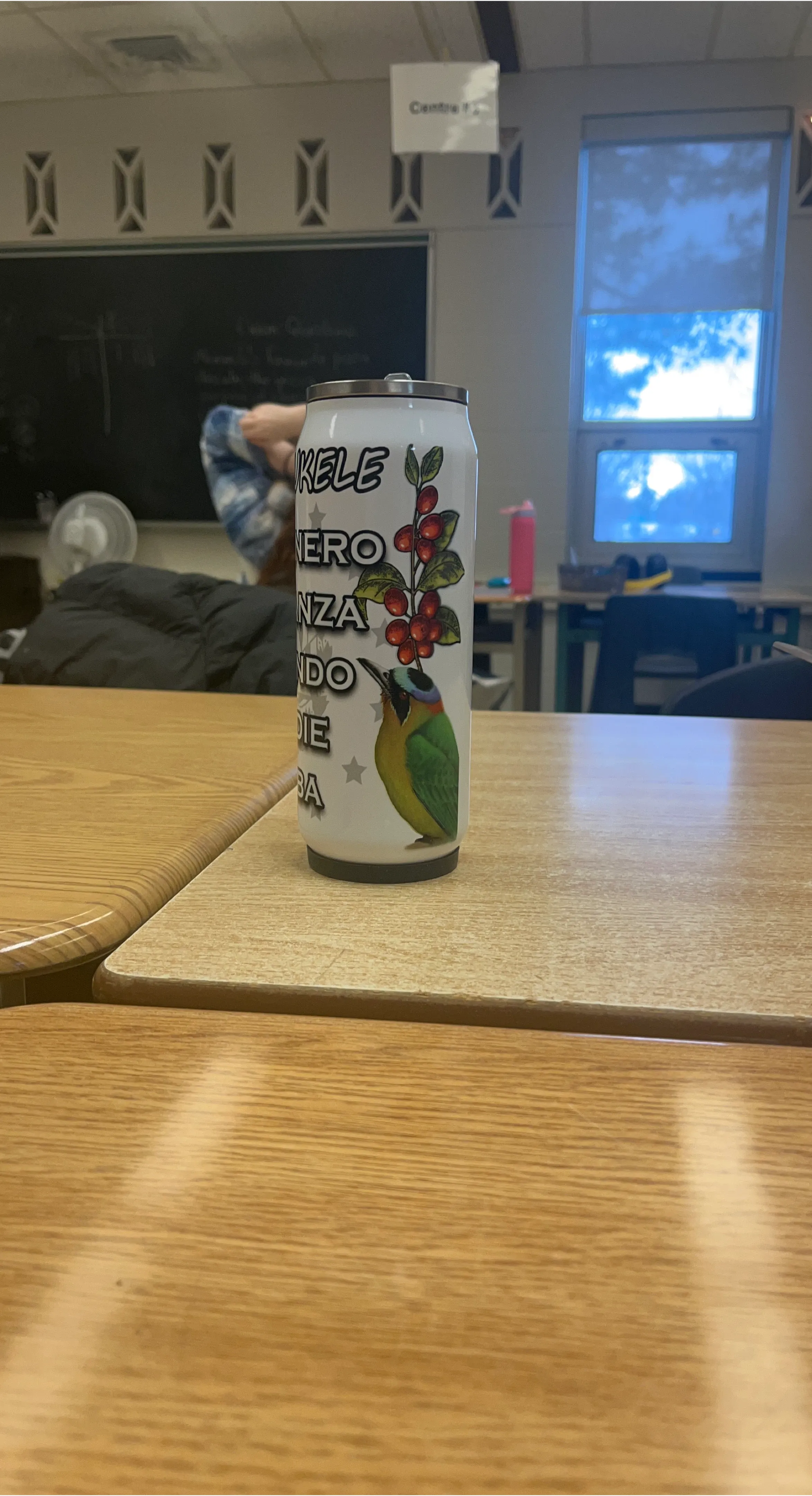This is a reusable tumbler featuring a vibrant design of a bird and coffee beans. It's made from durable material and comes with a secure lid. Perfect for keeping your beverages at the desired temperature.