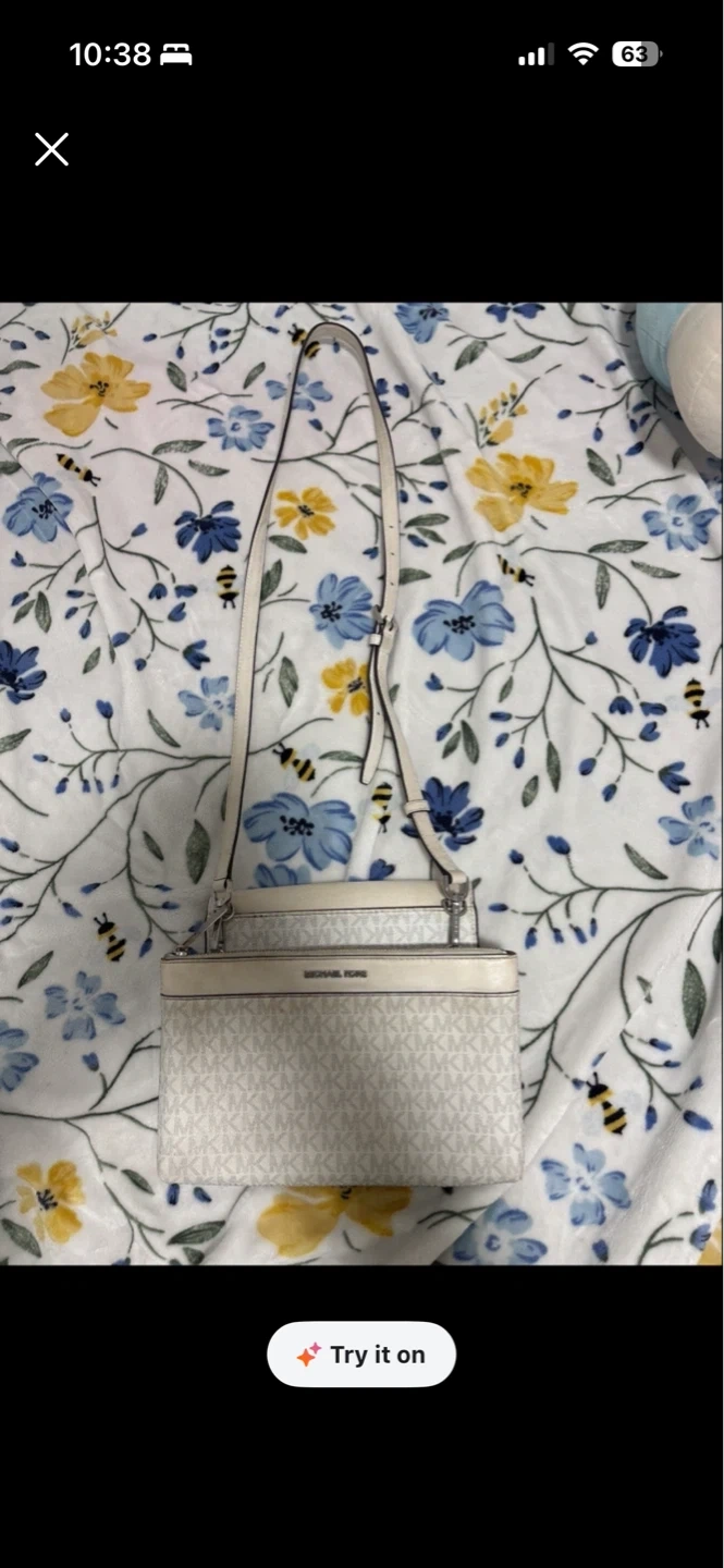 This is a white Michael Kors crossbody bag. It features the brand's signature monogram pattern. The bag has a detachable strap. Pick up cash only