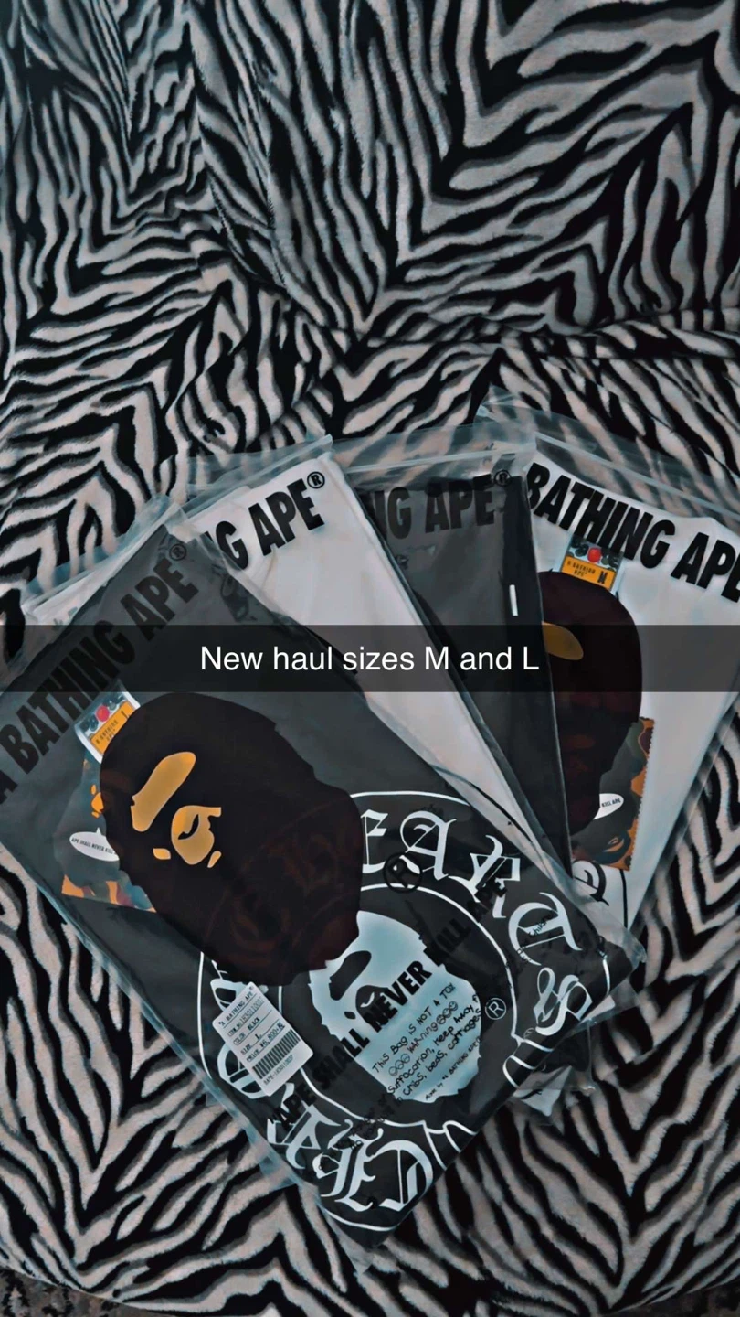 This is a new haul of A Bathing Ape t-shirts. They're available in sizes medium and large. Comes in original packaging.