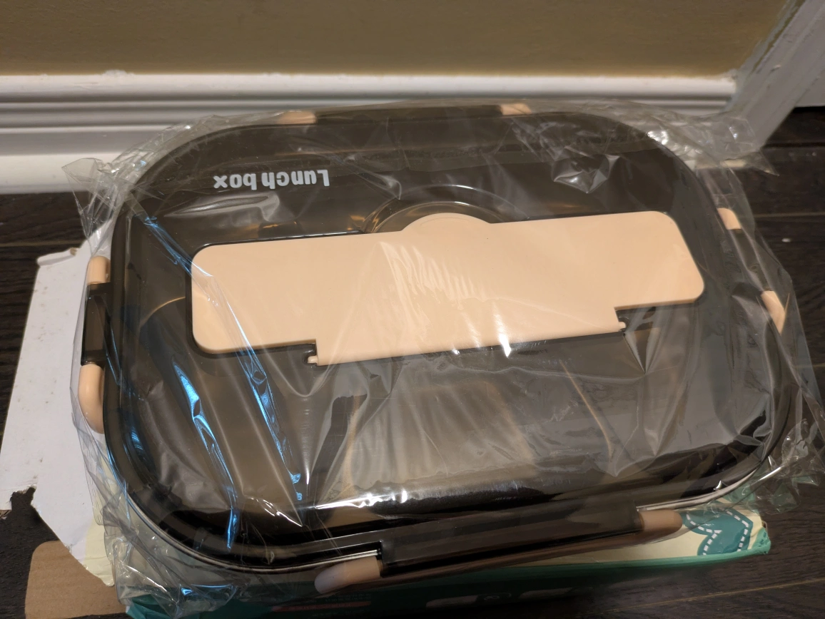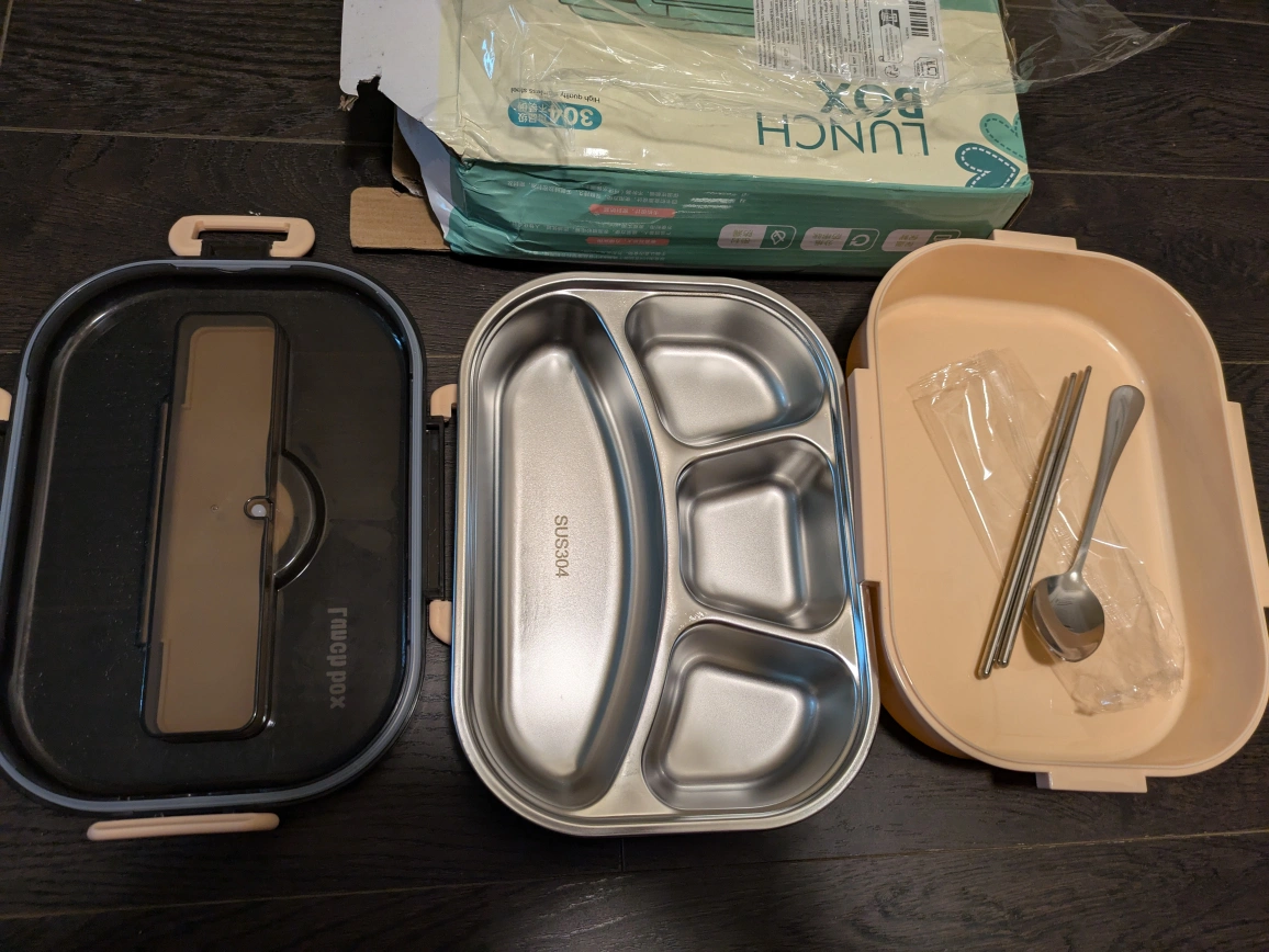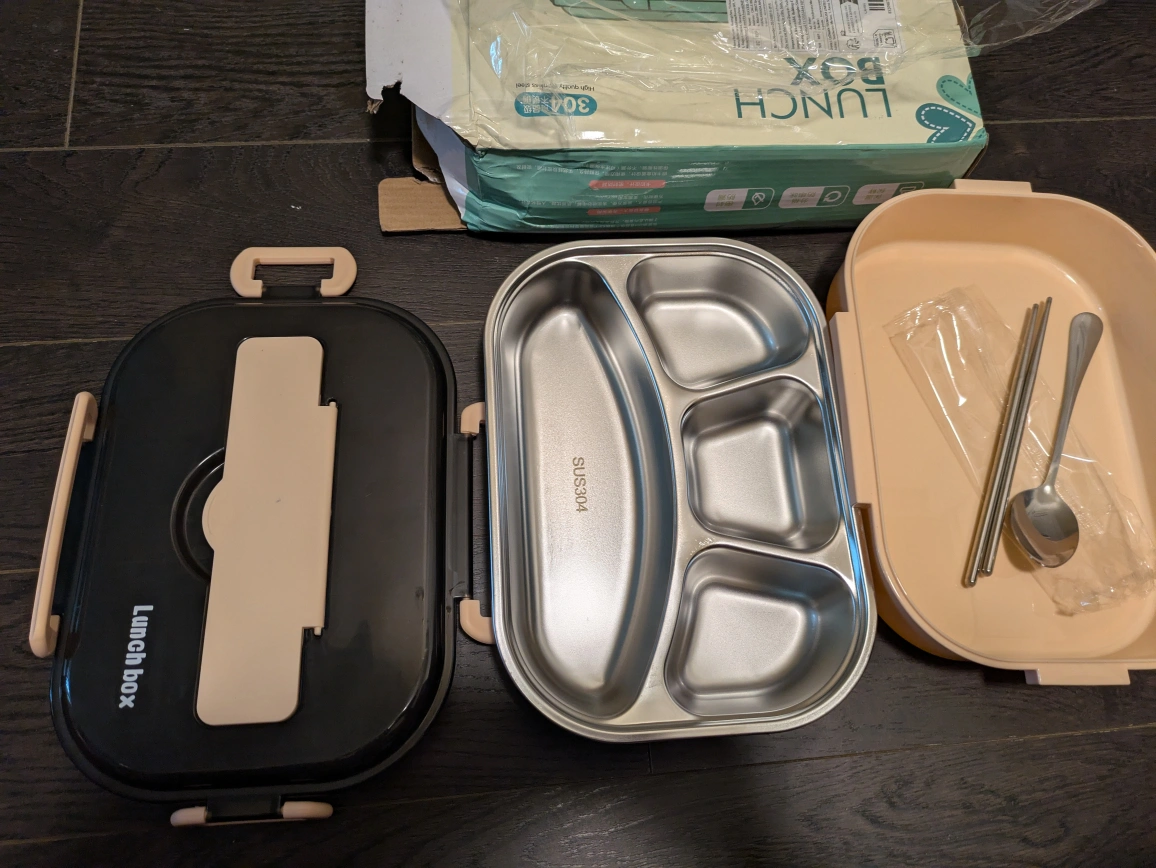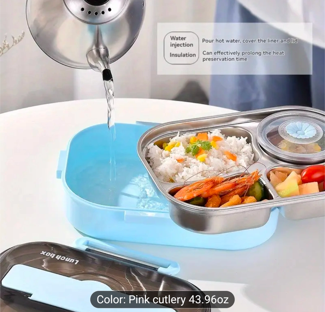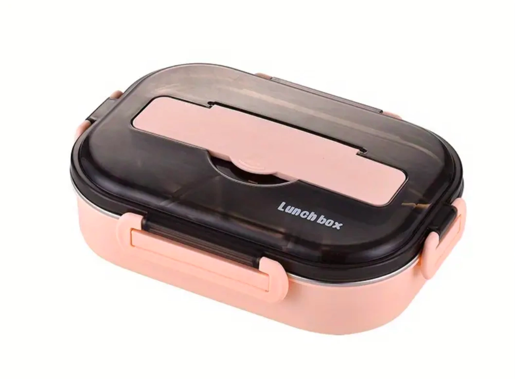 This is a large-sized lunch box with a four-grid design (A). It comes in a pretty pink colour and includes cutlery. It's designed with a four-row buckle to be sealed and leak-proof. The lid also has a silicone gasket to keep everything fresh and leak-free!