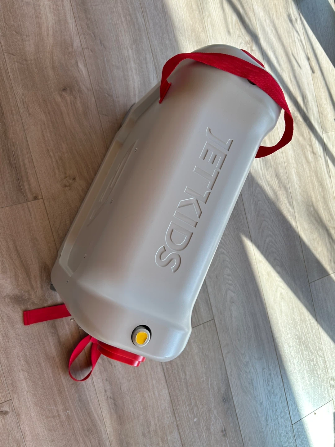 This JetKids Bedbox is a ride-on suitcase that converts into a bed for kids on planes. It's made of durable plastic and includes a mattress and straps. Perfect for making long journeys more comfortable for little ones!