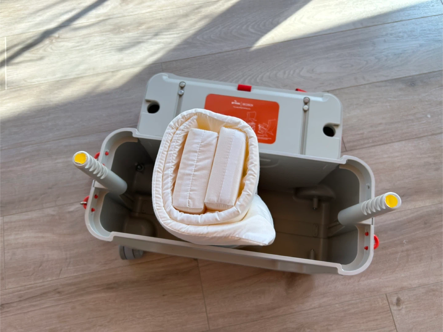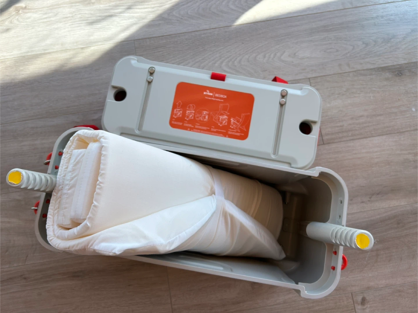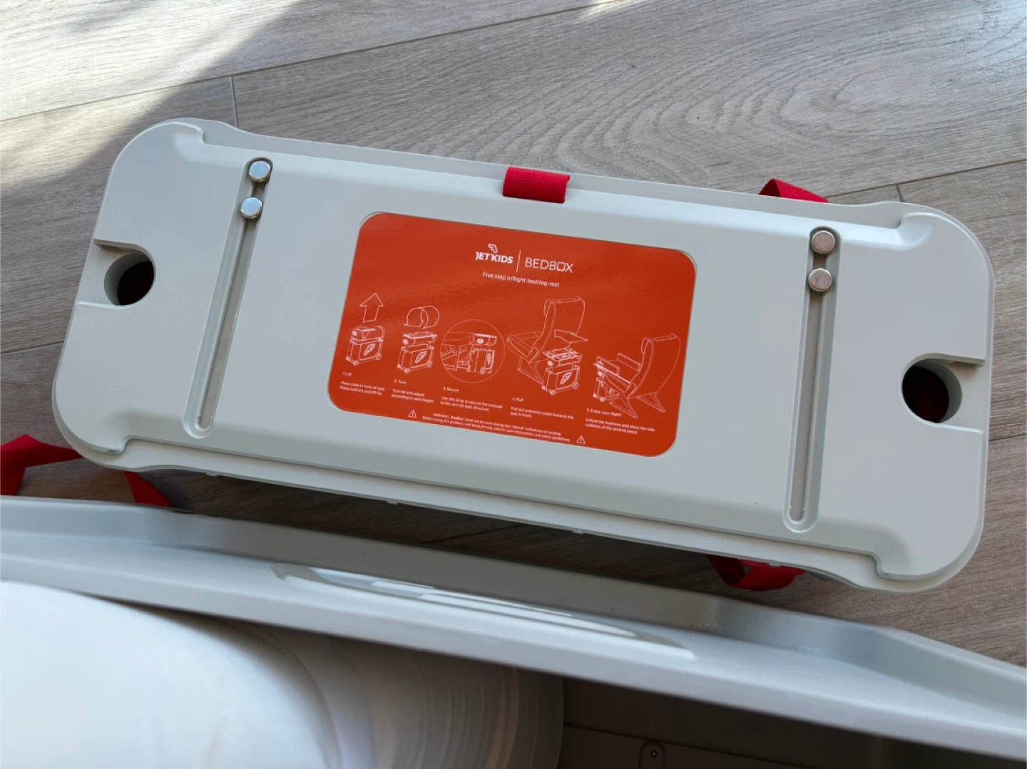 This JetKids Bedbox is a ride-on suitcase that converts into a bed for kids on planes. It's made of durable plastic and includes a mattress and straps. Perfect for making long journeys more comfortable for little ones!