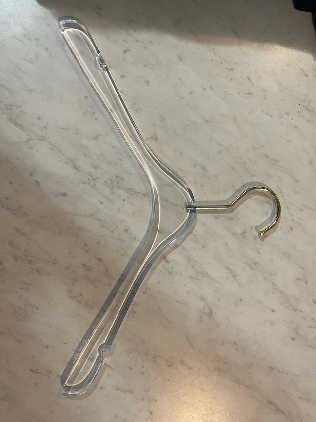 Elevate your closet with these chic, clear acrylic hangers, each measuring 15 inches in length. These hangers have been previously loved, so they're not brand new, but they're in great shape and ready to give your garments a touch of modern elegance. Material: High-quality acrylic, Colour: Clear, Hook: Gold, Width: 15 inches. Looking to add a touch of minimalist sophistication to your wardrobe? These hangers are just the ticket! And hey, if you're seeing this ad, you can bet your bottom dollar these hangers are still up for grabs! Cash accepted.