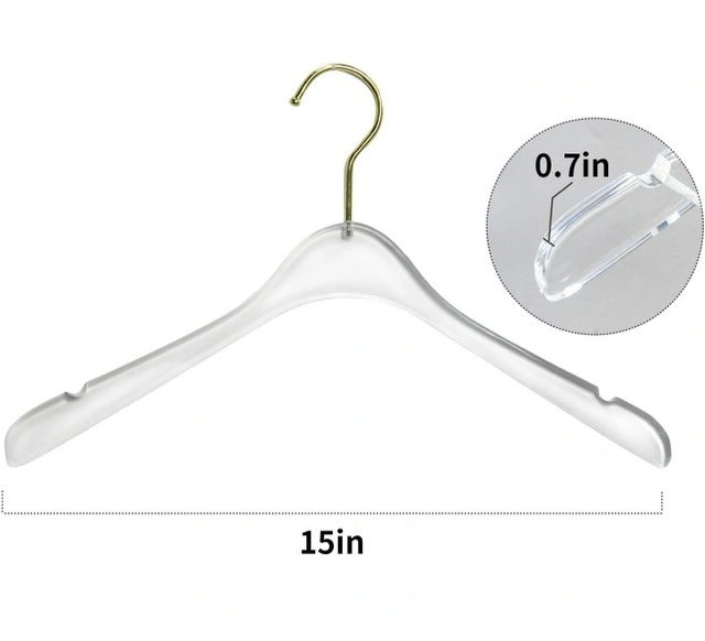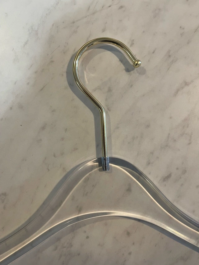 Elevate your closet with these chic, clear acrylic hangers, each measuring 15 inches in length. These hangers have been previously loved, so they're not brand new, but they're in great shape and ready to give your garments a touch of modern elegance. Material: High-quality acrylic, Colour: Clear, Hook: Gold, Width: 15 inches. Looking to add a touch of minimalist sophistication to your wardrobe? These hangers are just the ticket! And hey, if you're seeing this ad, you can bet your bottom dollar these hangers are still up for grabs! Cash accepted.