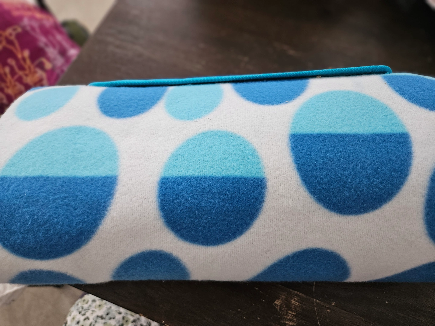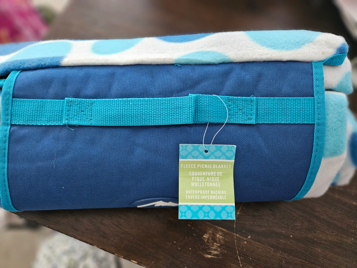 New fleece picnic blanket, waterproof backing. Blue and teal colour scheme.