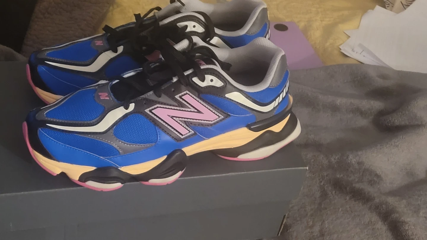 These New Balance 9060 sneakers feature a striking blue, pink, and yellow colorway. They're made with a mix of mesh and leather for a comfortable fit. The original box is included with your purchase. These are great for everyday wear!