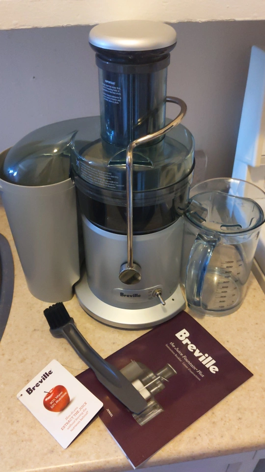 This is a Breville Juice Fountain Plus juicer. Includes all pieces shown, including the pulp container, cleaning brush, and instruction manual. Has spent most of its time in my cupboard so has not had much use but works fine. There are surface scratches on the clear plastic (third pic) from a little extra zealous cleaning. Also has some minor hard water spotting.