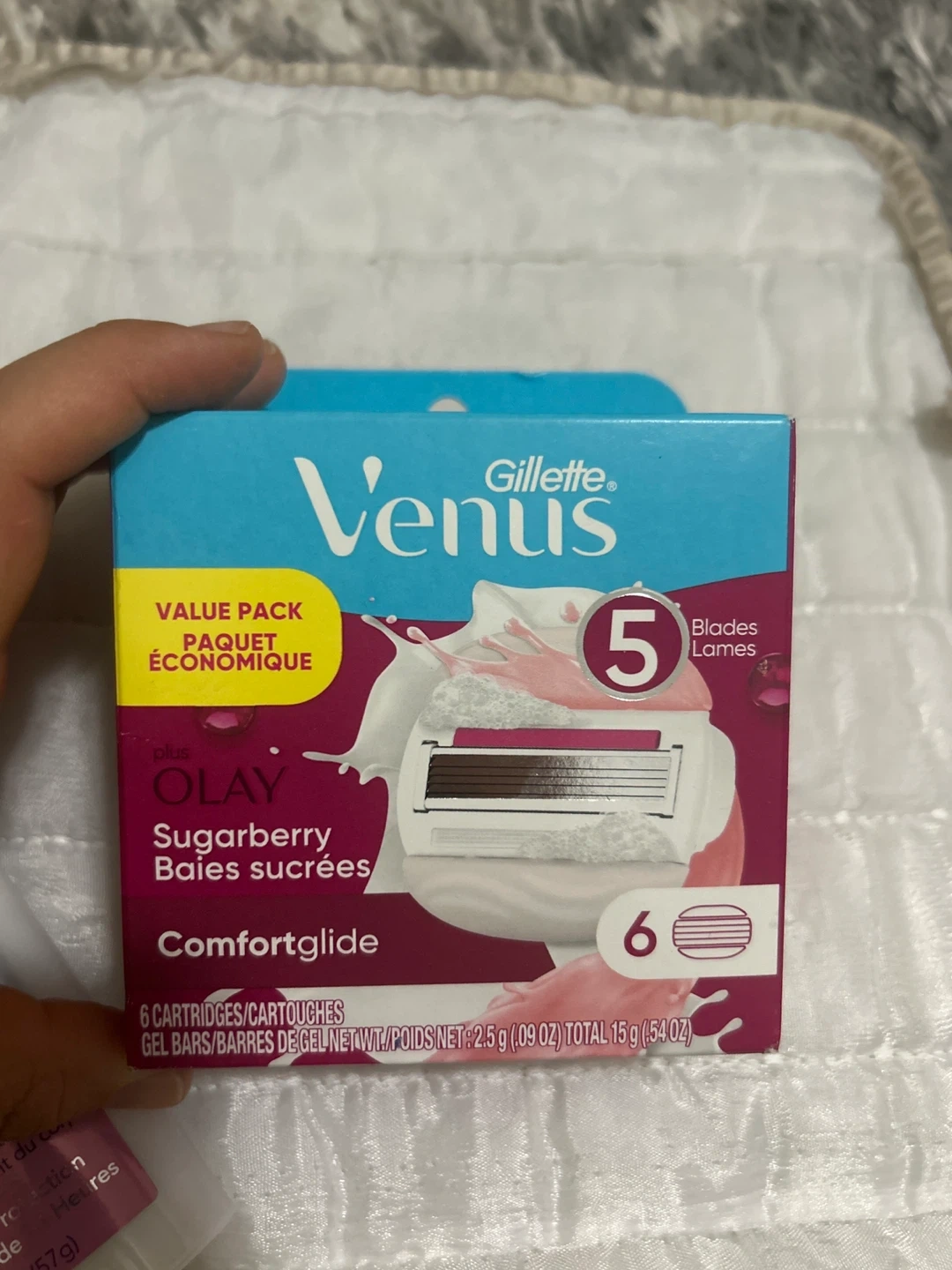 Selling a pack of Gillette Venus Comfortglide Sugarberry razor cartridges. This is a value pack with 6 cartridges. The razors have 5 blades for a smooth shave. They also feature Olay Sugarberry for comfortglide.