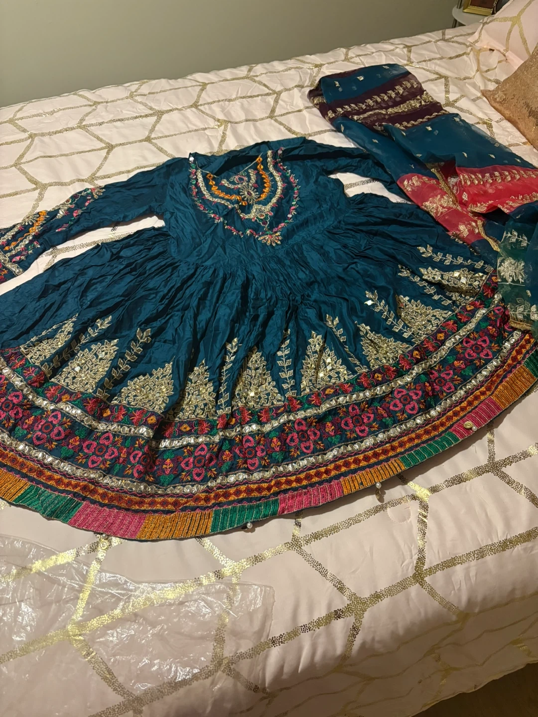 Beautiful teal anarkali dress featuring intricate embroidery and gold accents. It's paired with vibrant orange pants and a coordinating dupatta. This outfit is perfect for festive occasions and celebrations!