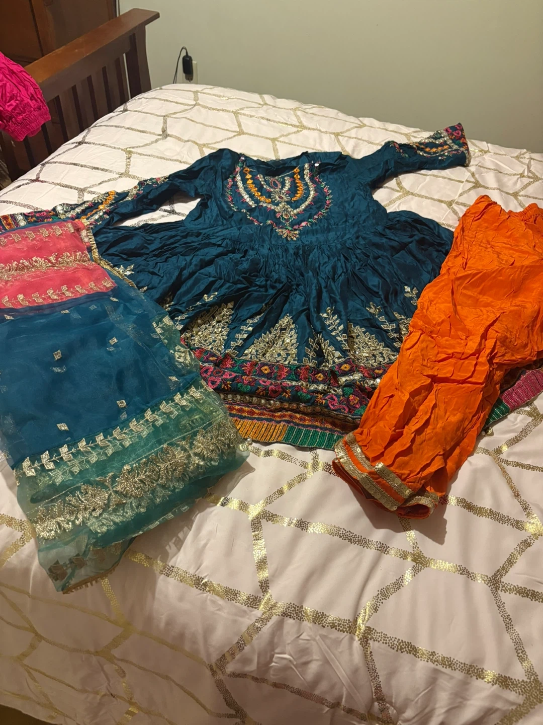 Beautiful teal anarkali dress featuring intricate embroidery and gold accents. It's paired with vibrant orange pants and a coordinating dupatta. This outfit is perfect for festive occasions and celebrations!