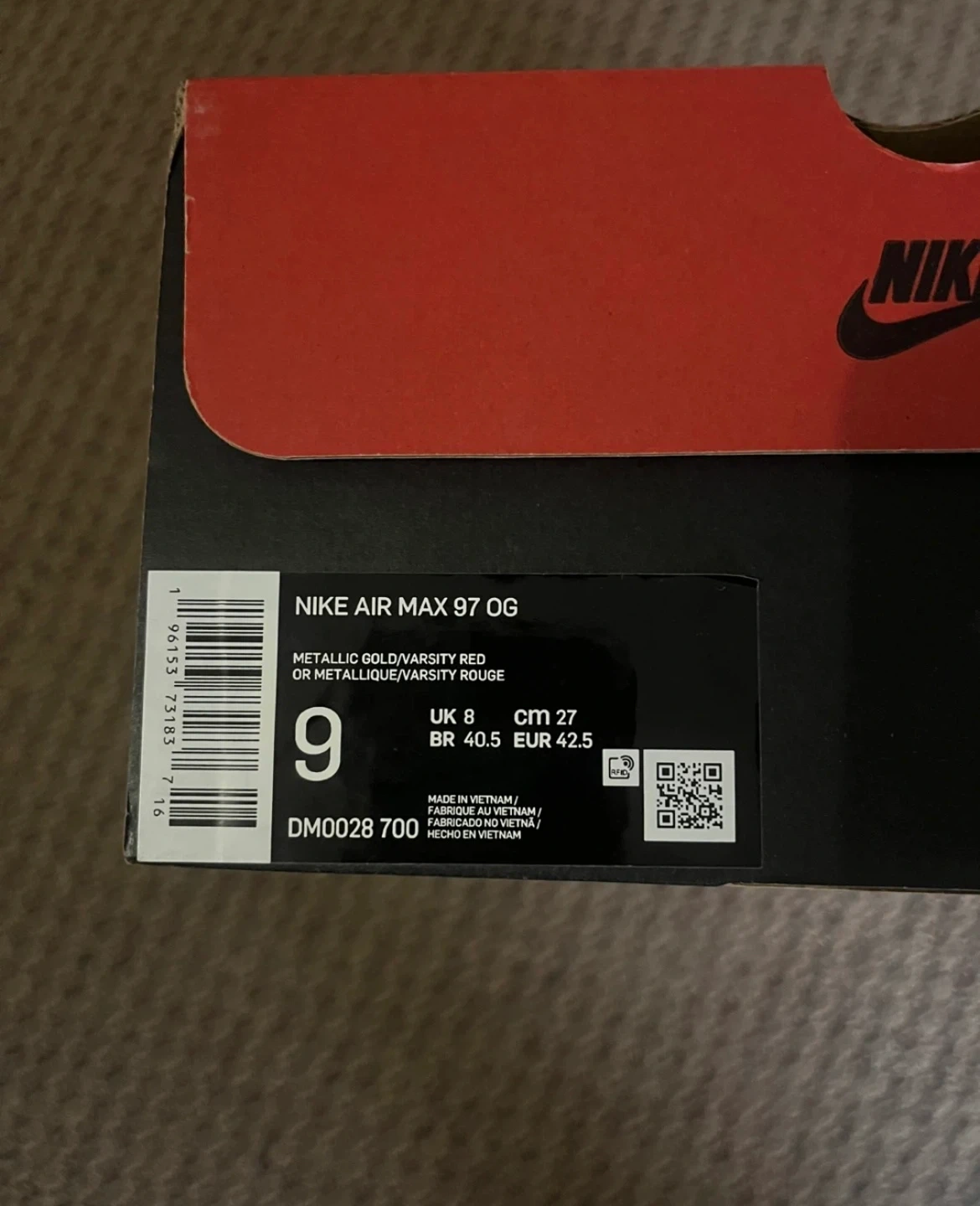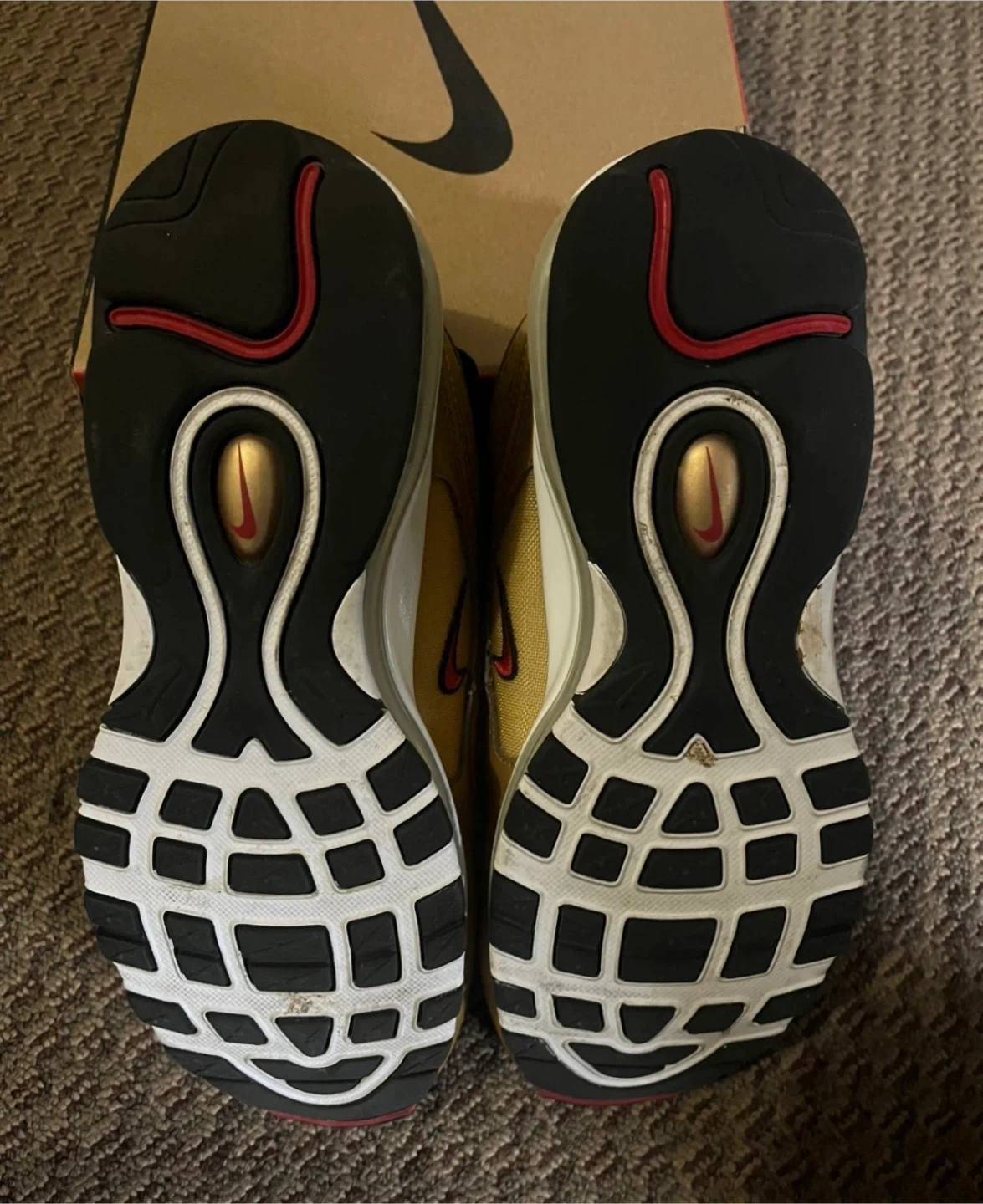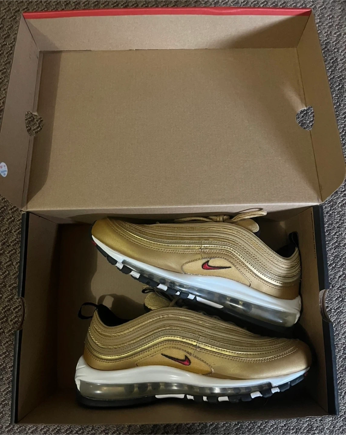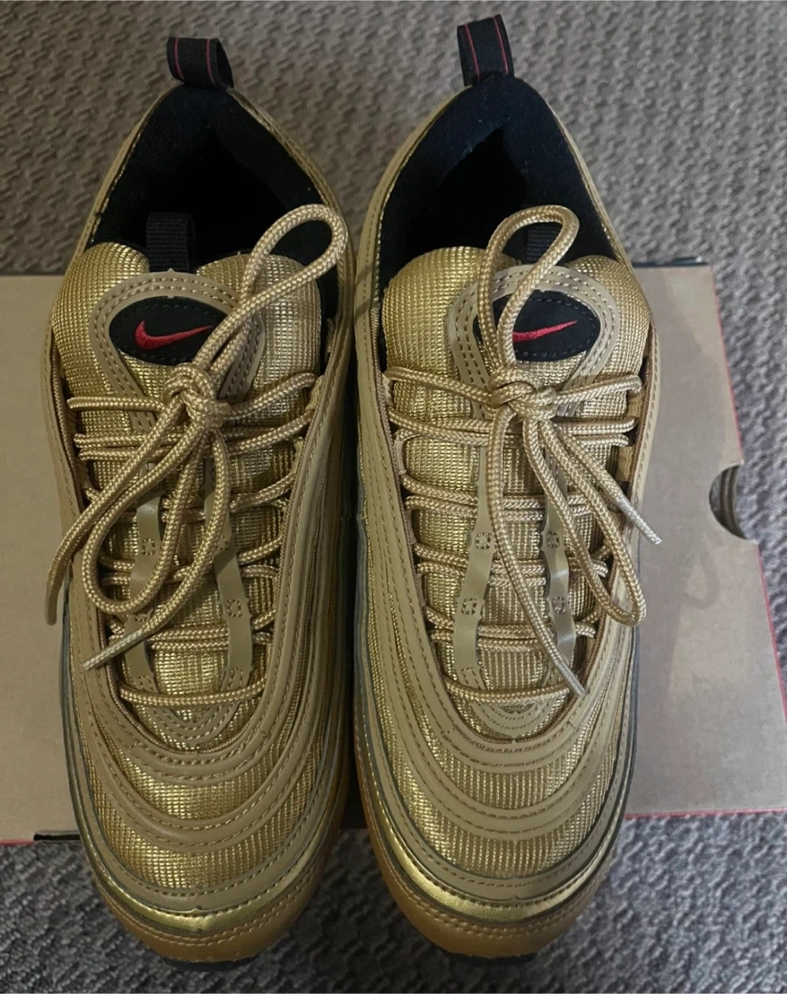 Selling a pair of Nike Air Max 97 OG sneakers in a metallic gold and varsity red colourway! They are a size 9 and come with the original box