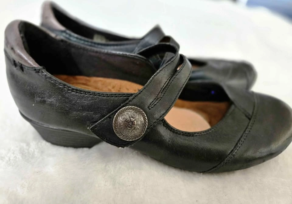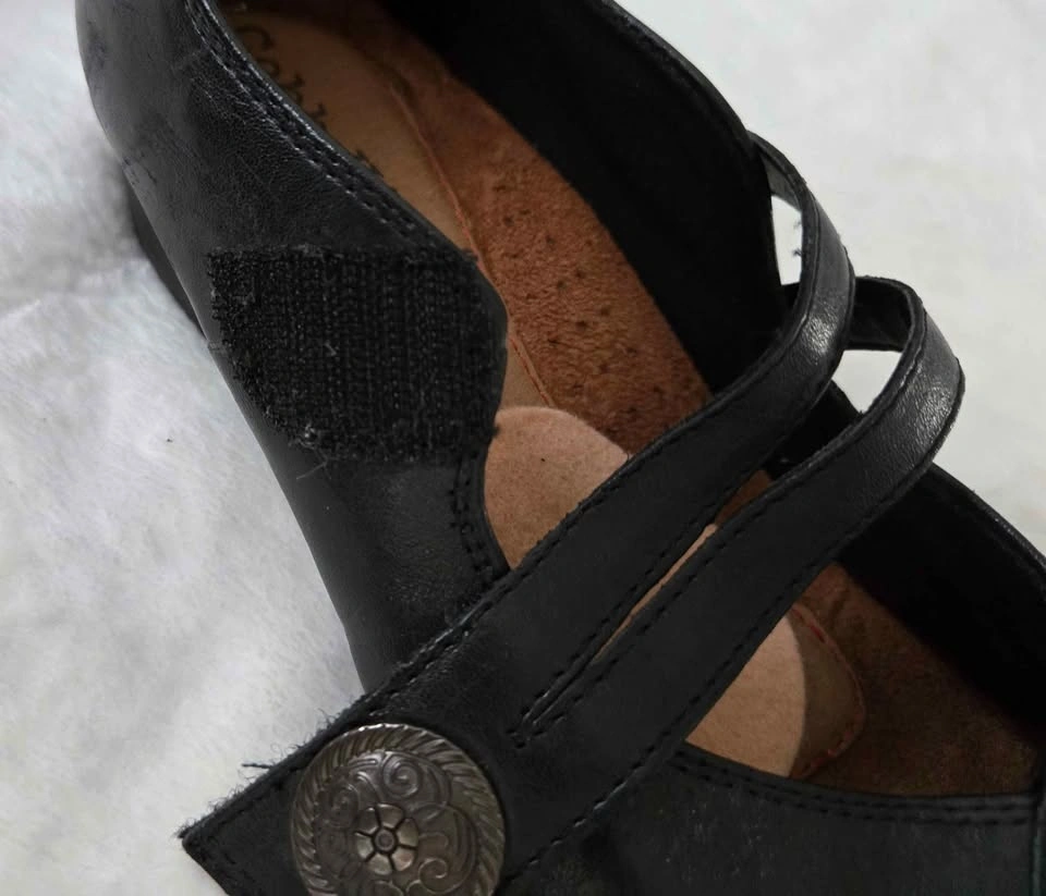 Cute black leather Mary Jane shoes by New Balance Cobb Hill. Velcro strap secure side closure. Raised heel cup. Size 7 1/2. No scuffs or scratches. Pickup in Lakeview in S.W.
