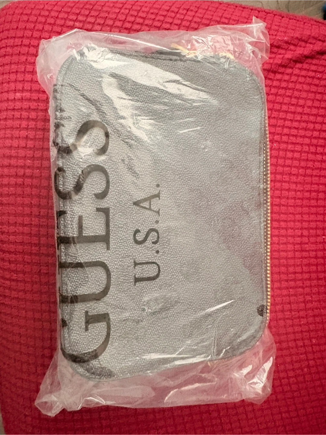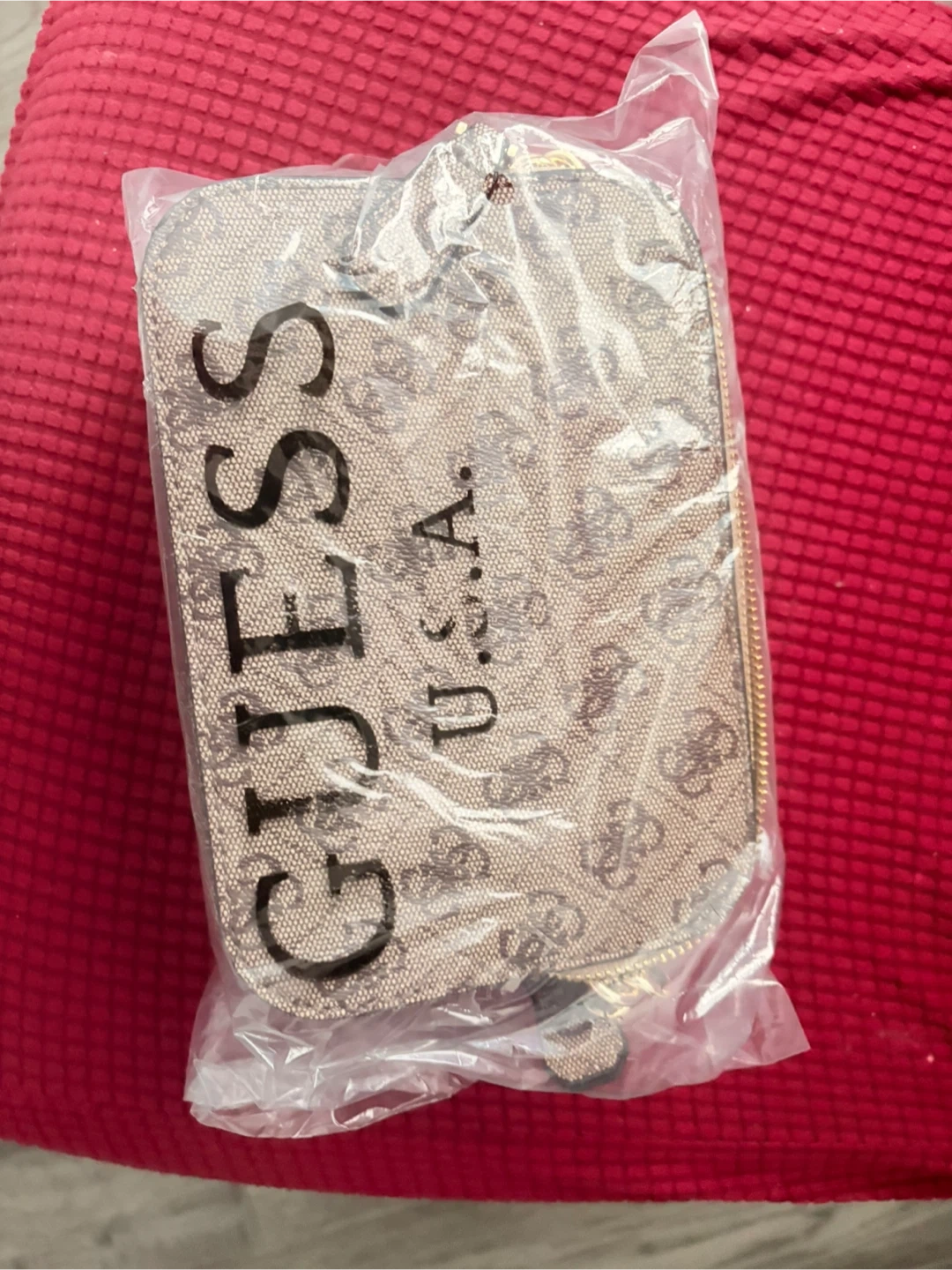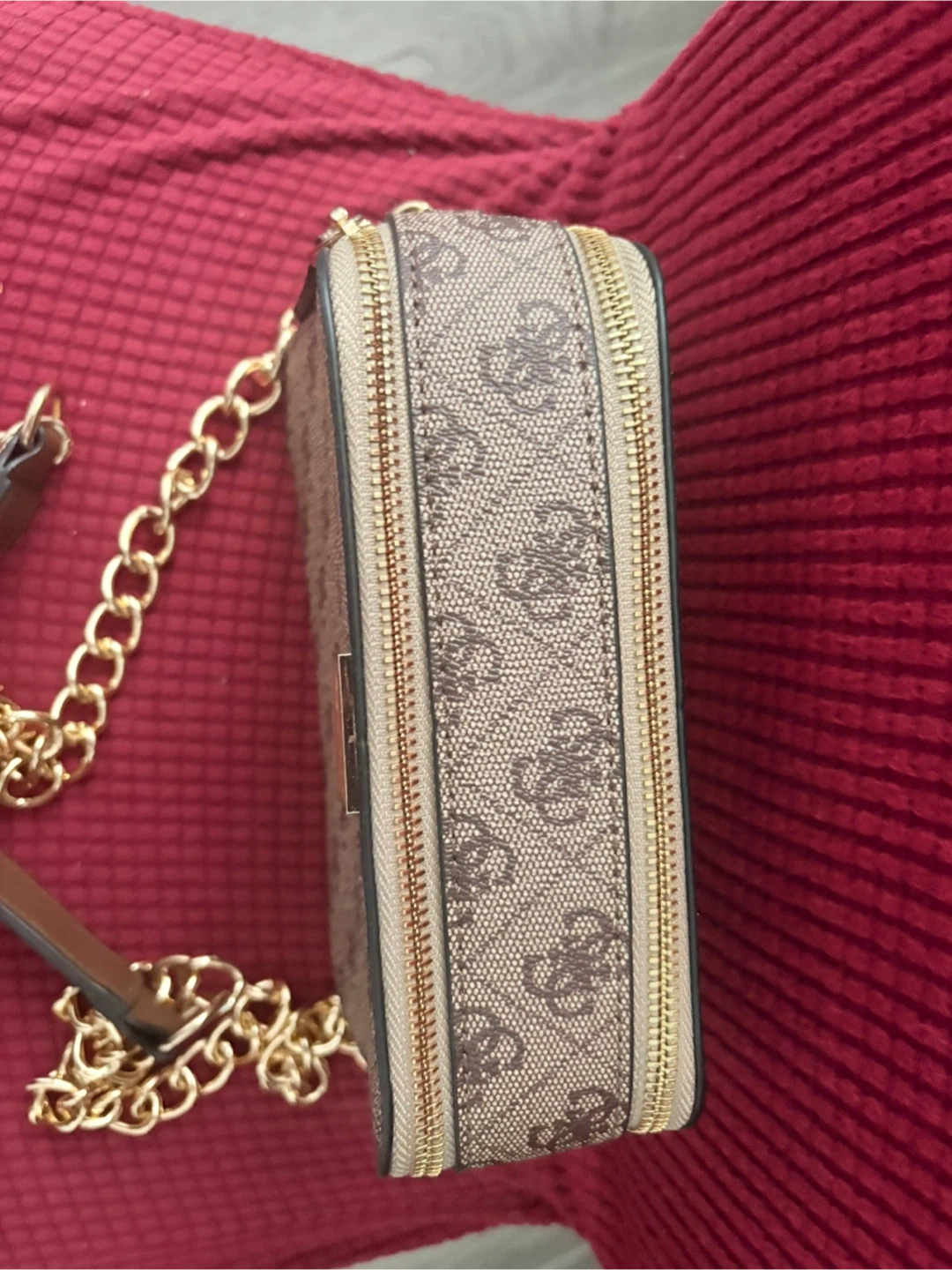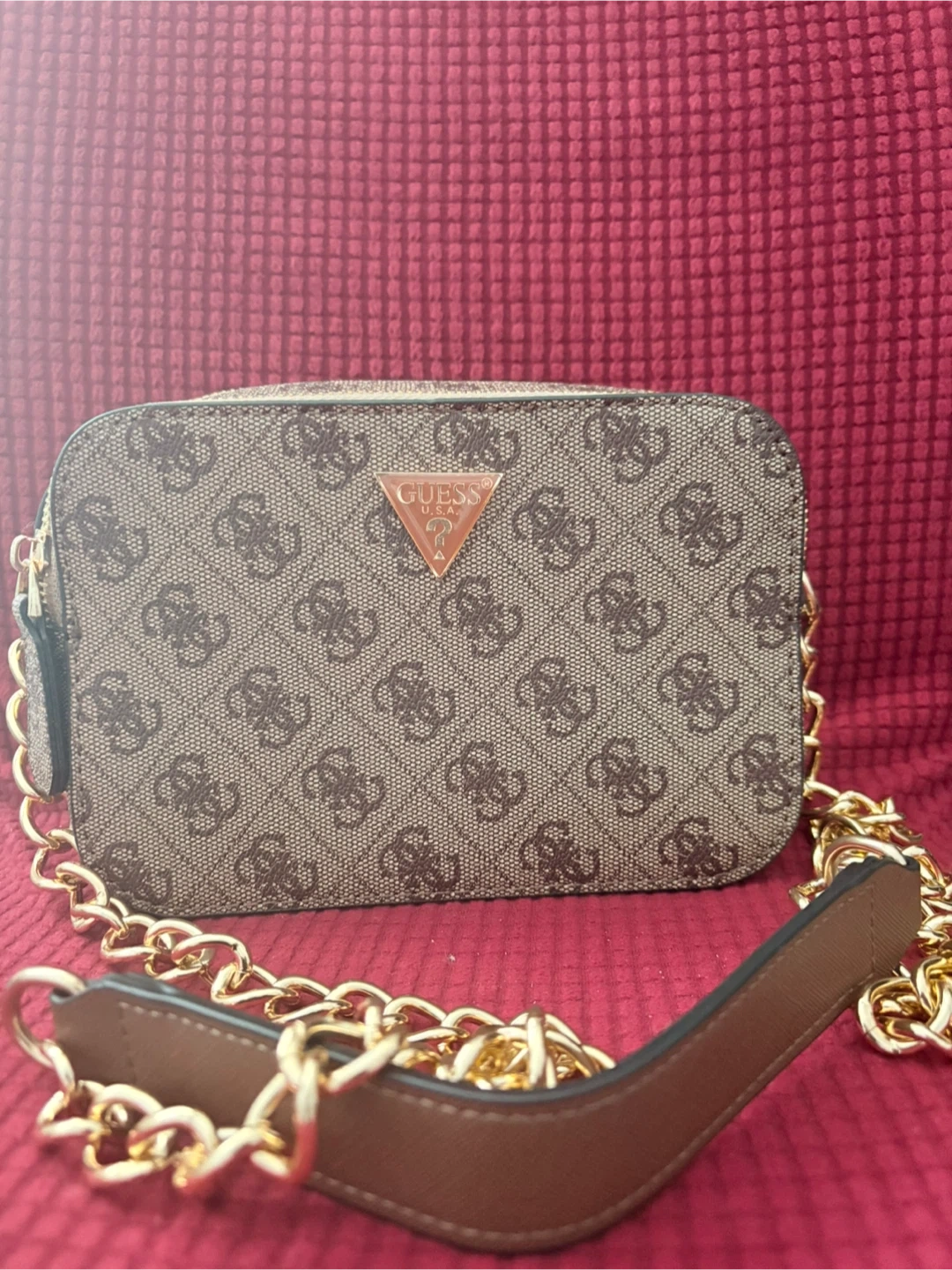 This is a stylish Guess camera bag with a signature all-over logo print. It features a secure zippered closure and a chic gold-tone chain strap with a leather accent. Comes in original packaging.