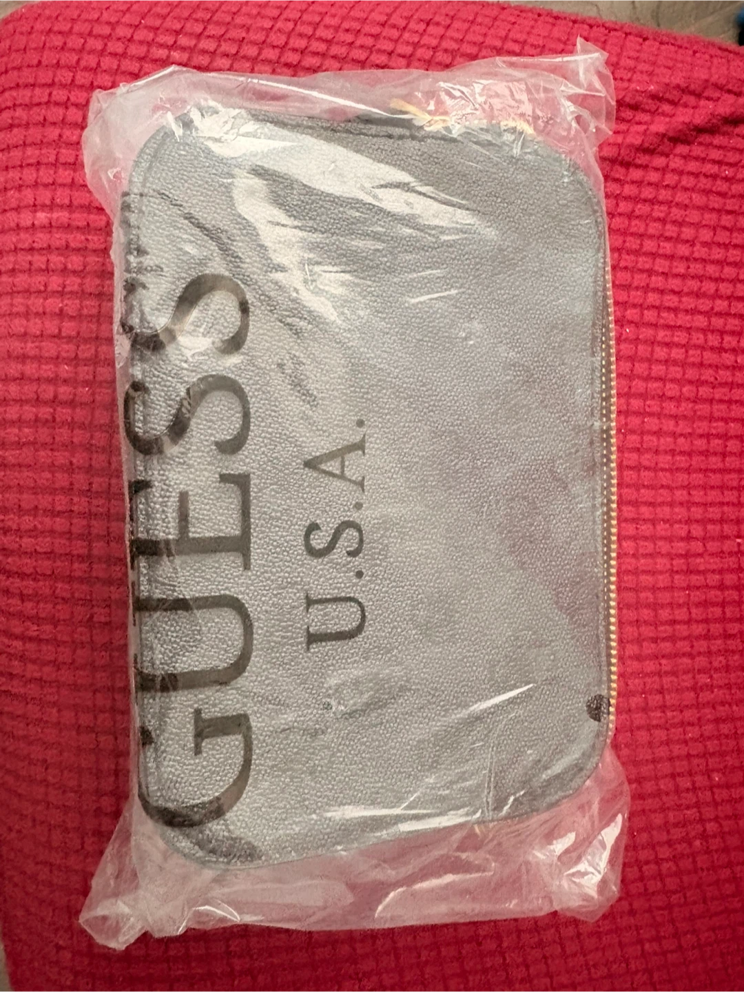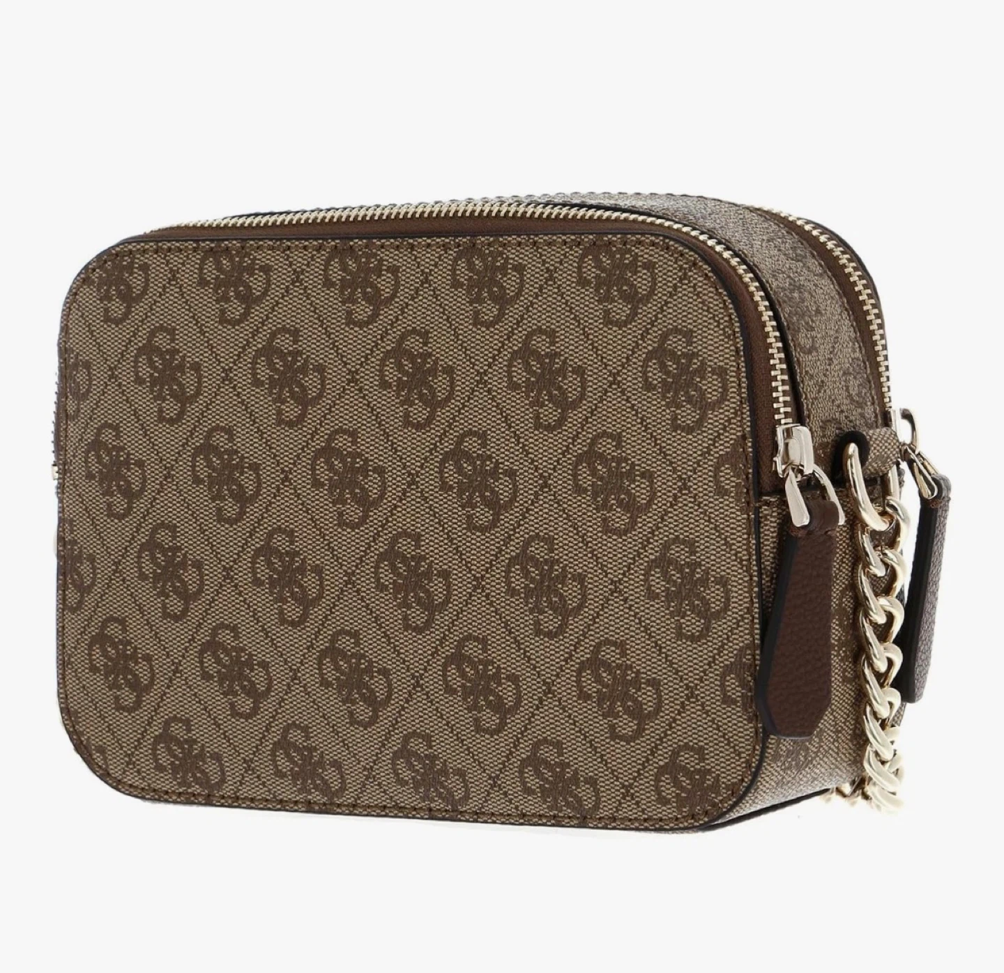 This is a stylish Guess camera bag with a signature all-over logo print. It features a secure zippered closure and a chic gold-tone chain strap with a leather accent. Comes in original packaging.