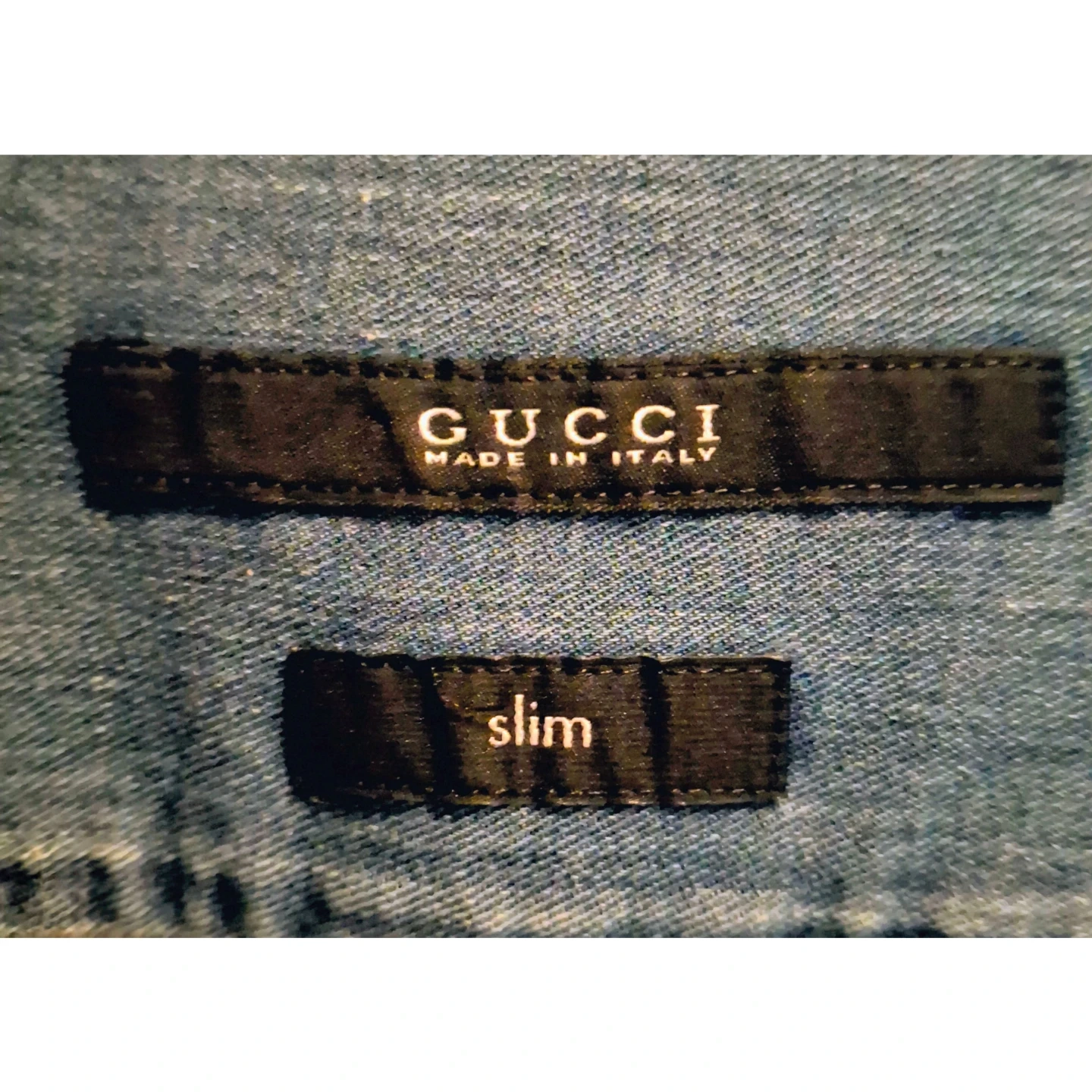 Item shows slight signs of wear and wash throughout. Item is a vintage Gucci brand shirt. Size 15 1/2 | 39. Note that item shows fading/ slight yellowing on item's collar area. Overall fading of the item's color due to wear and wash. Faint yellowing mark on surface.