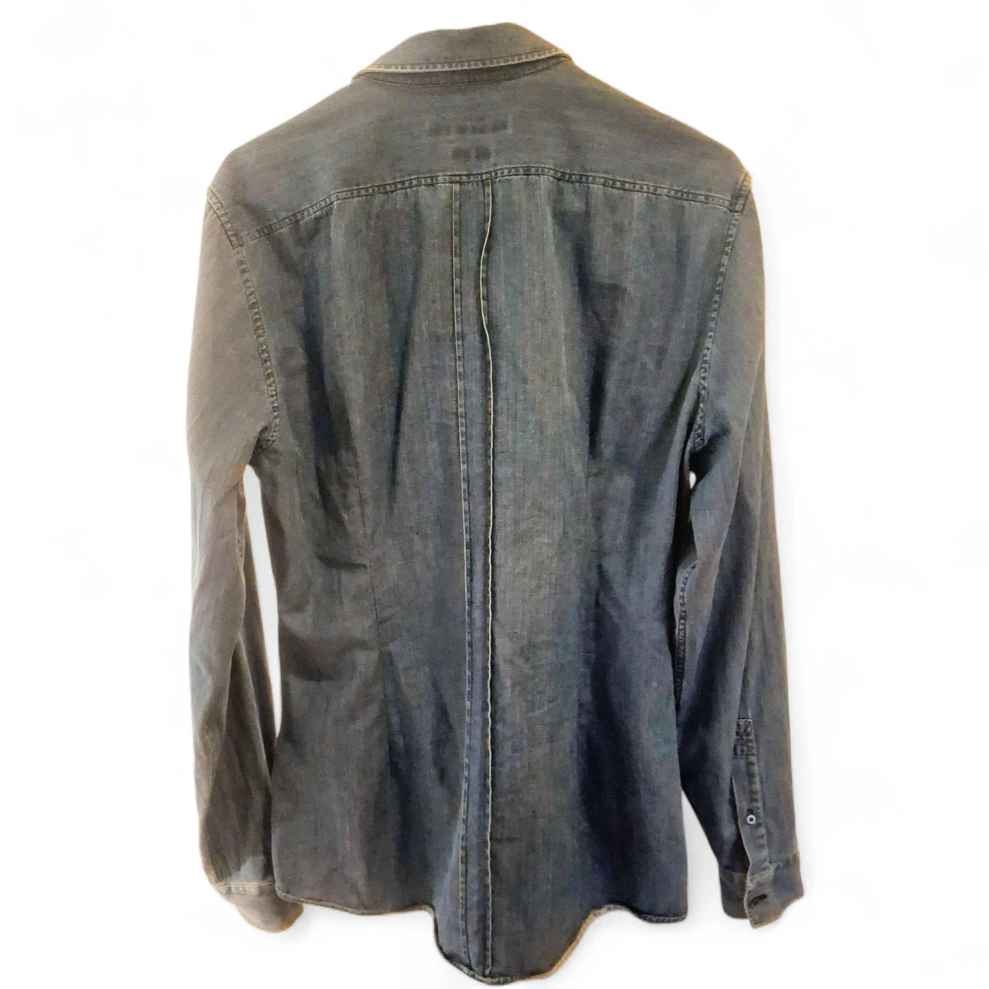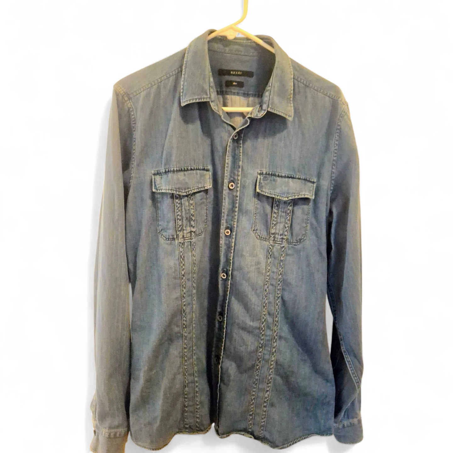 Item shows slight signs of wear and wash throughout. Item is a vintage Gucci brand shirt. Size 15 1/2 | 39. Note that item shows fading/ slight yellowing on item's collar area. Overall fading of the item's color due to wear and wash. Faint yellowing mark on surface.