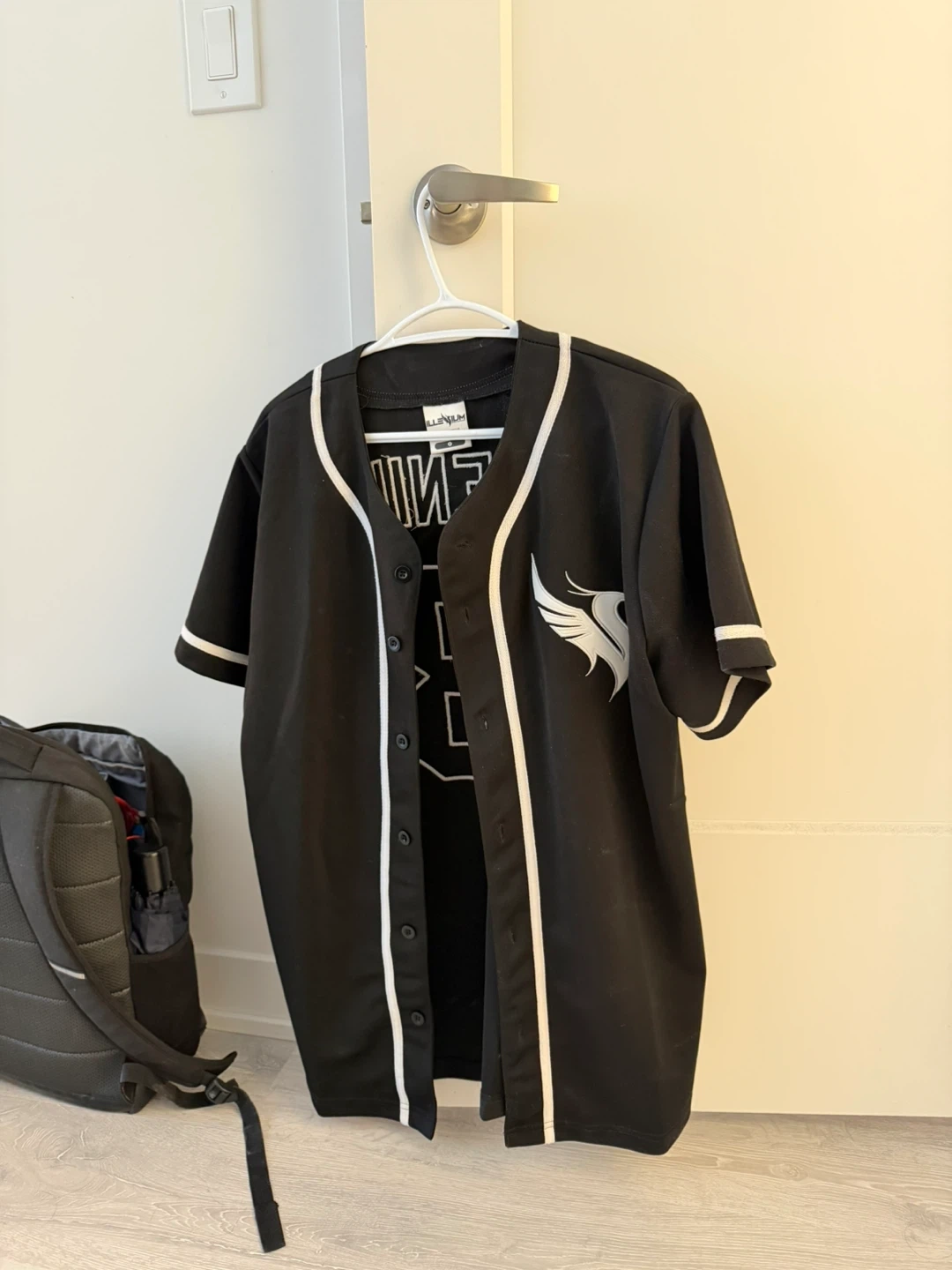 Illenium jersey with white piping and a white logo on the chest. Button-up front with short sleeves. Likely made of polyester or a blend. Perfect for casual wear or as fan apparel.