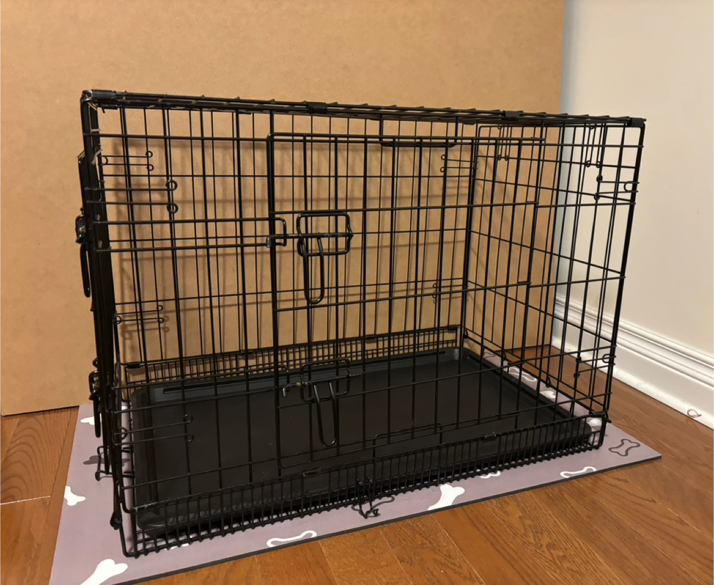 Selling a black wire dog crate. It has a removable bottom tray for easy cleaning.