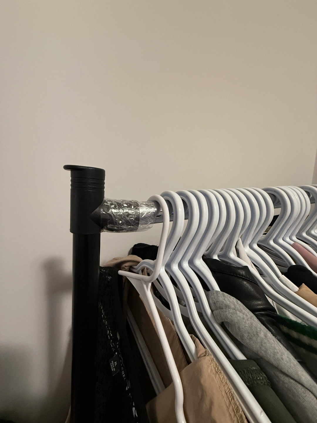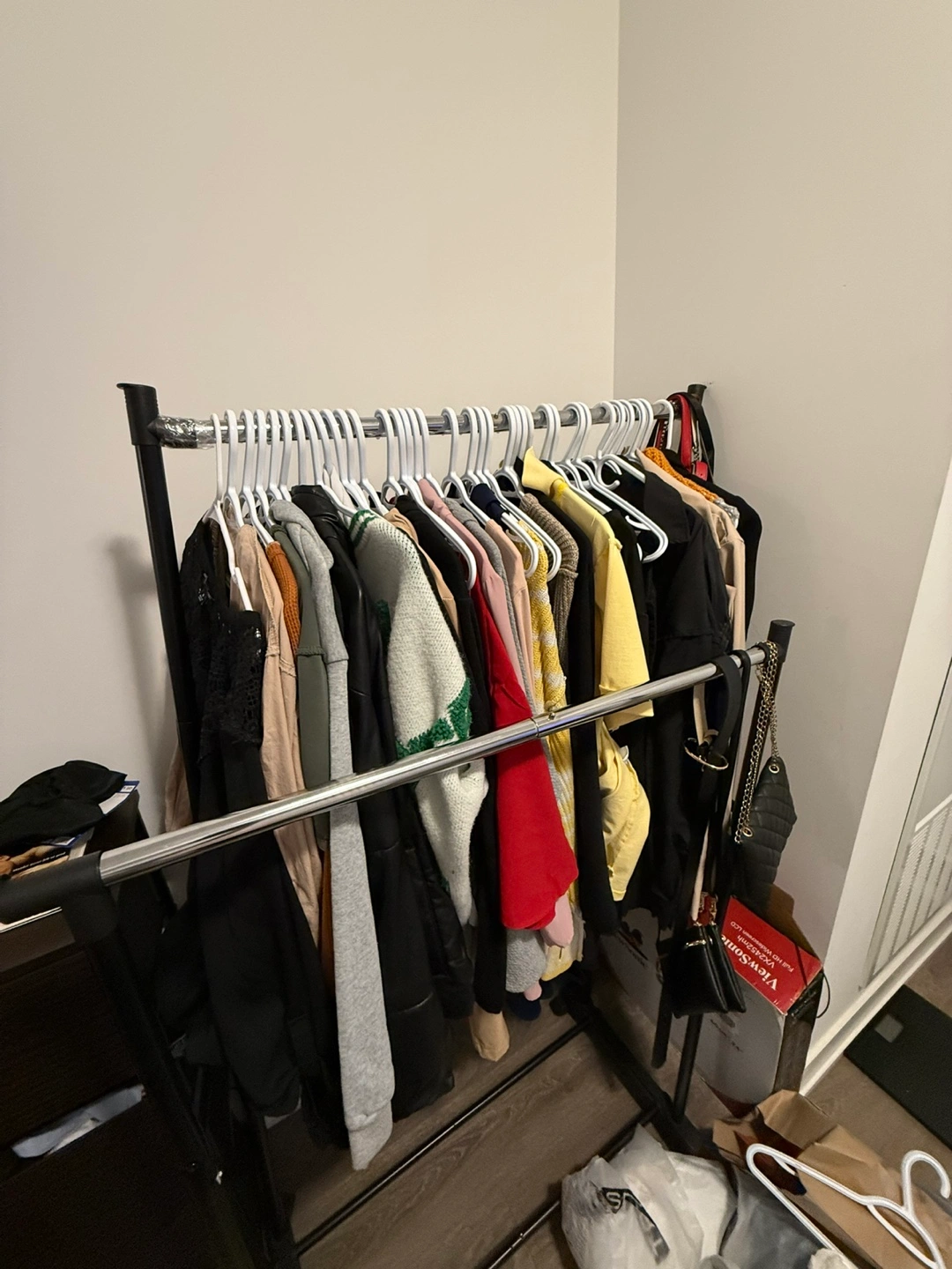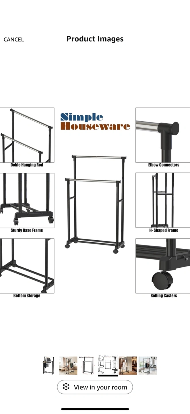 Selling a Simple Houseware double rod clothing rack. It's black and has rolling casters for easy moving. Dimensions are approximately 33.75" wide, 64" tall, and 17" deep. Perfect for adding extra hanging space!