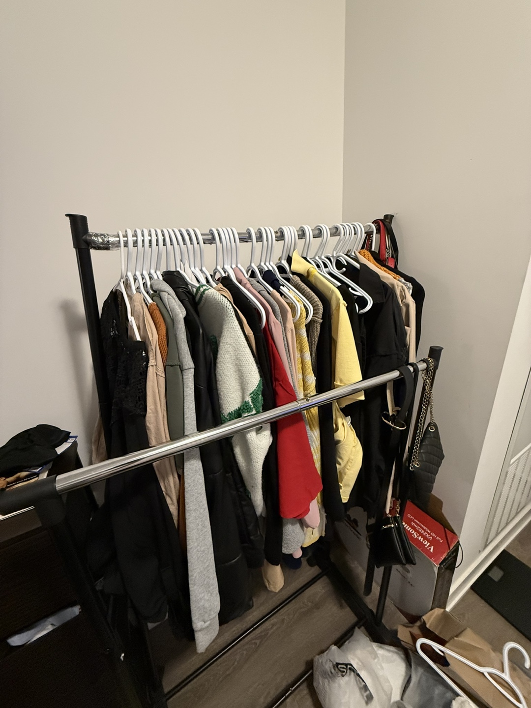 Selling a Simple Houseware double rod clothing rack. It's black and has rolling casters for easy moving. Dimensions are approximately 33.75" wide, 64" tall, and 17" deep. Perfect for adding extra hanging space!