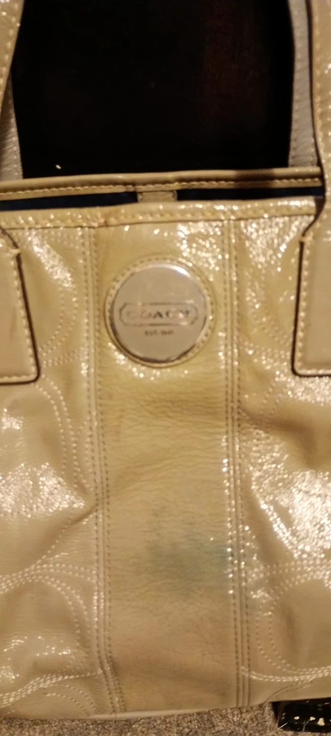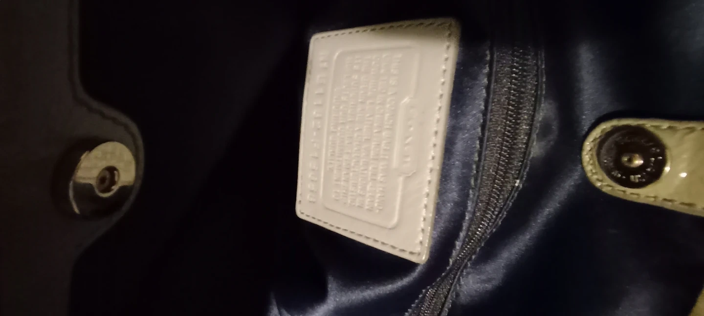 This is a Coach bag, crafted from full-grain cowhide leather. It features a beige patent exterior with signature embossing. The interior is lined with dark blue satin.