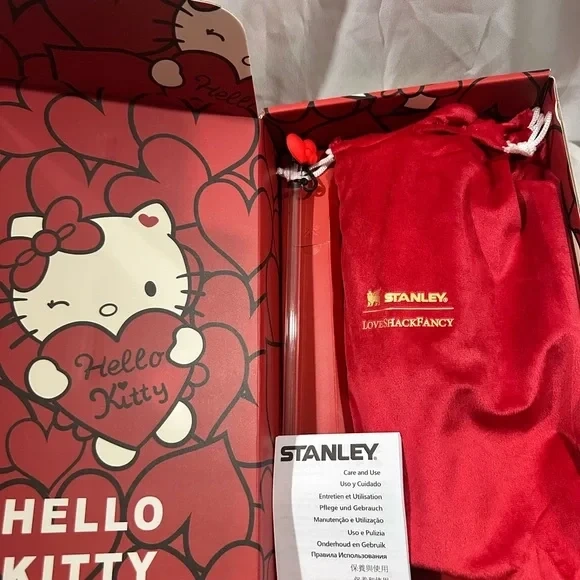 Stanley Quencher H2.0 Tumbler in collaboration with Hello Kitty. Comes with a reusable straw and straw topper. Available in pink and red colorways.