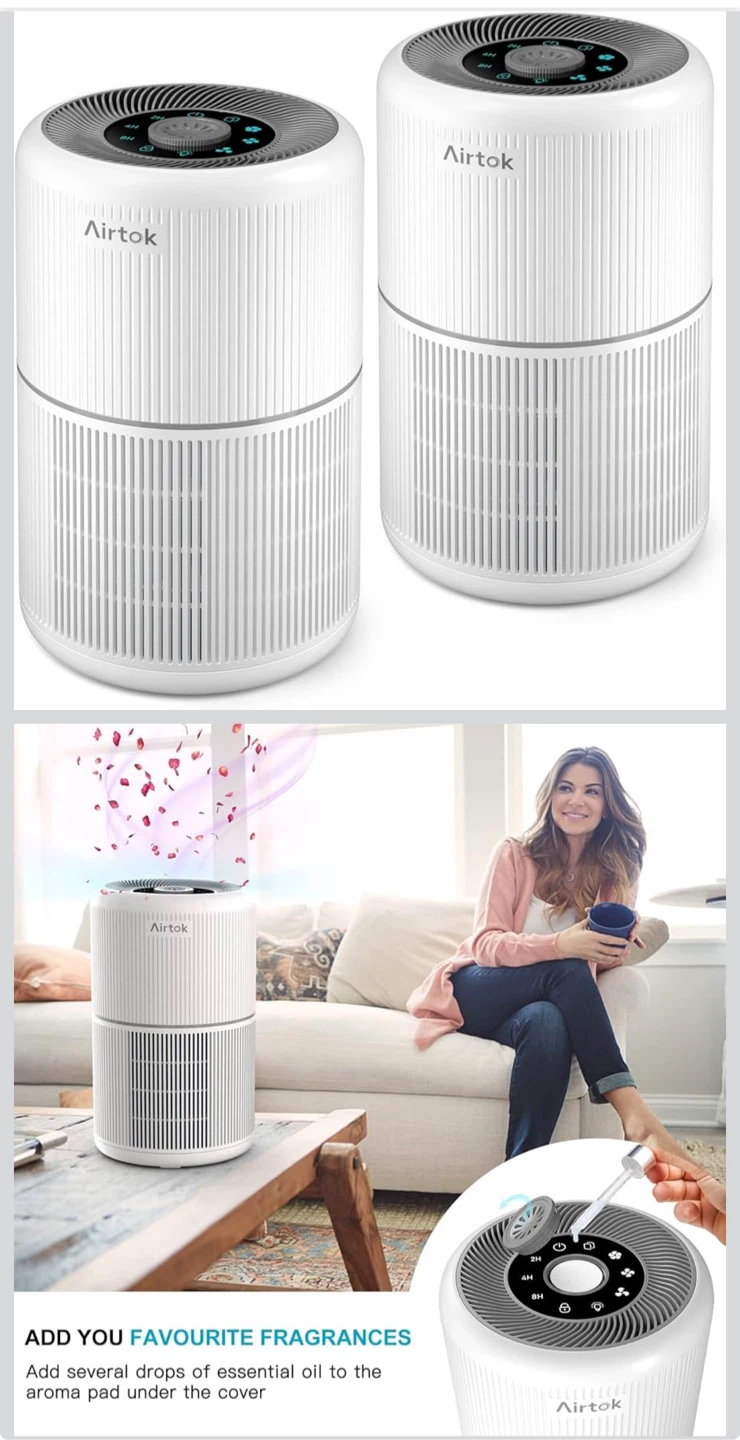 This Airtok air purifier features H13 True HEPA filtration, capturing 99.97% of airborne particles. It purifies an 183 ft³ room 5 times per hour. Add your favourite fragrances by dropping essential oil onto the aroma pad under the cover.
