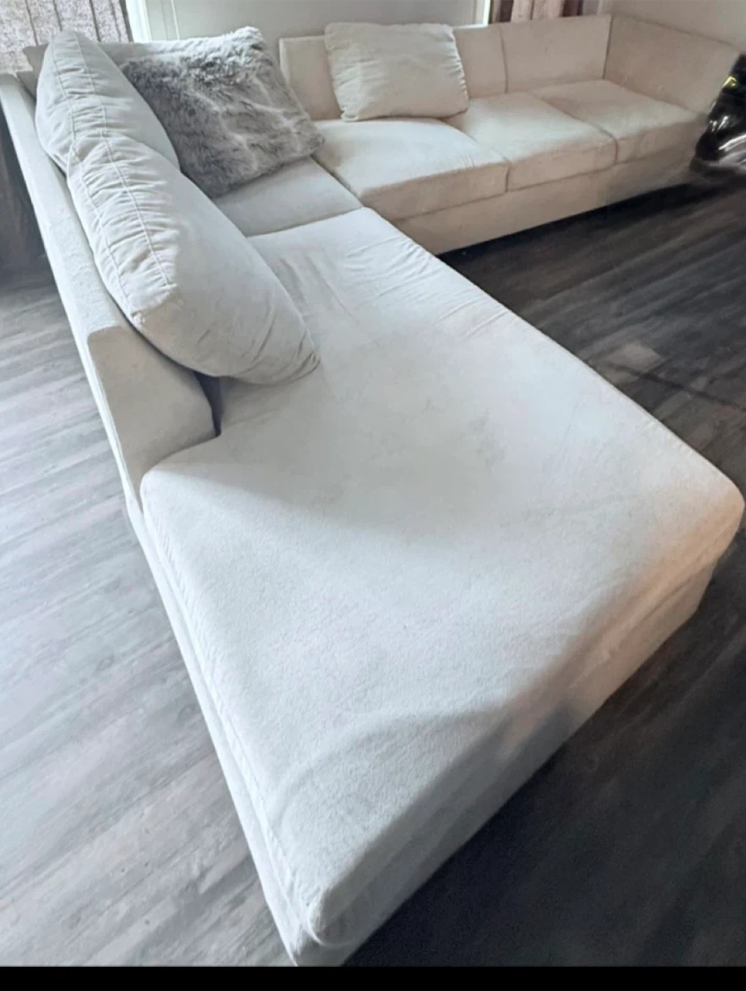A comfortable cream-coloured sectional sofa. It's made of a soft fabric and comes with multiple throw pillows. This sofa would be great for a living room or rec room!