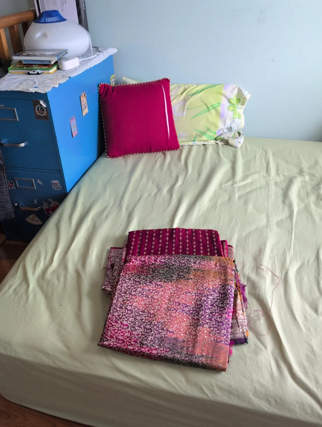 Beautifully folded fabric showcasing vibrant, intricate patterns. Likely silk or a silk blend, with rich colours of magenta, orange, purple and white. Suitable for crafting or as a decorative accent.