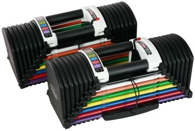 This is a set of PowerBlock adjustable dumbbells and a PowerBlock barbell. It's a great way to save space and switch weights quickly. The adjustable design allows for a wide range of resistance training.