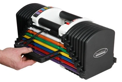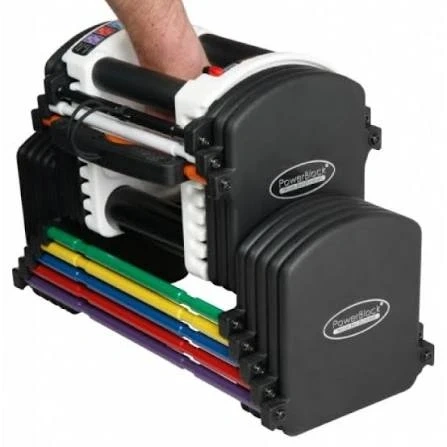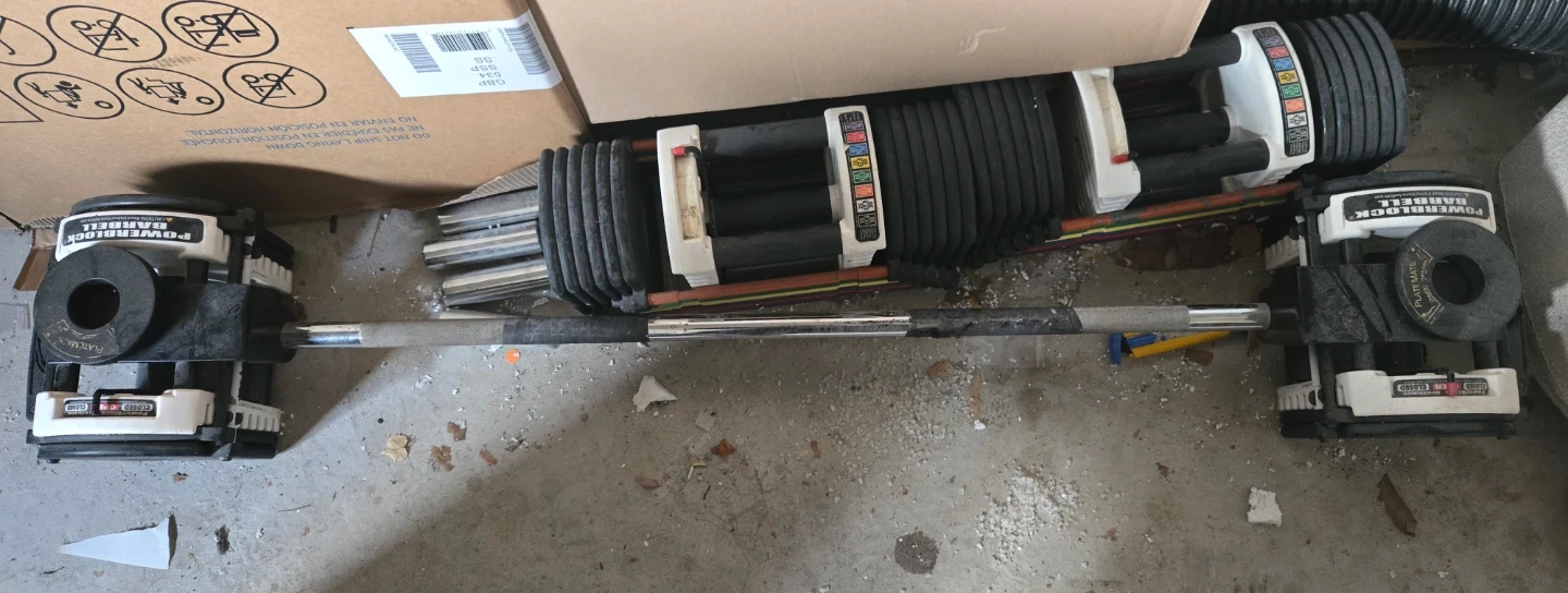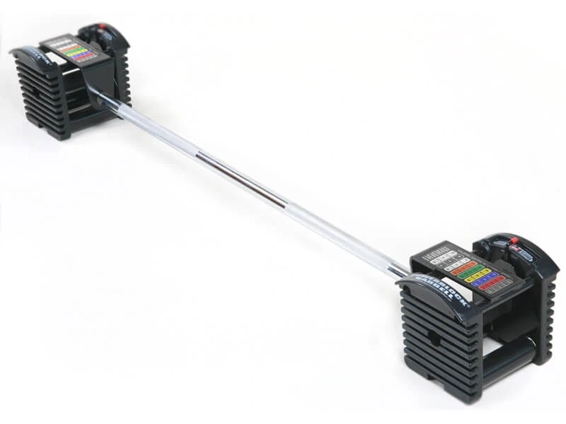 This is a set of PowerBlock adjustable dumbbells and a PowerBlock barbell. It's a great way to save space and switch weights quickly. The adjustable design allows for a wide range of resistance training.