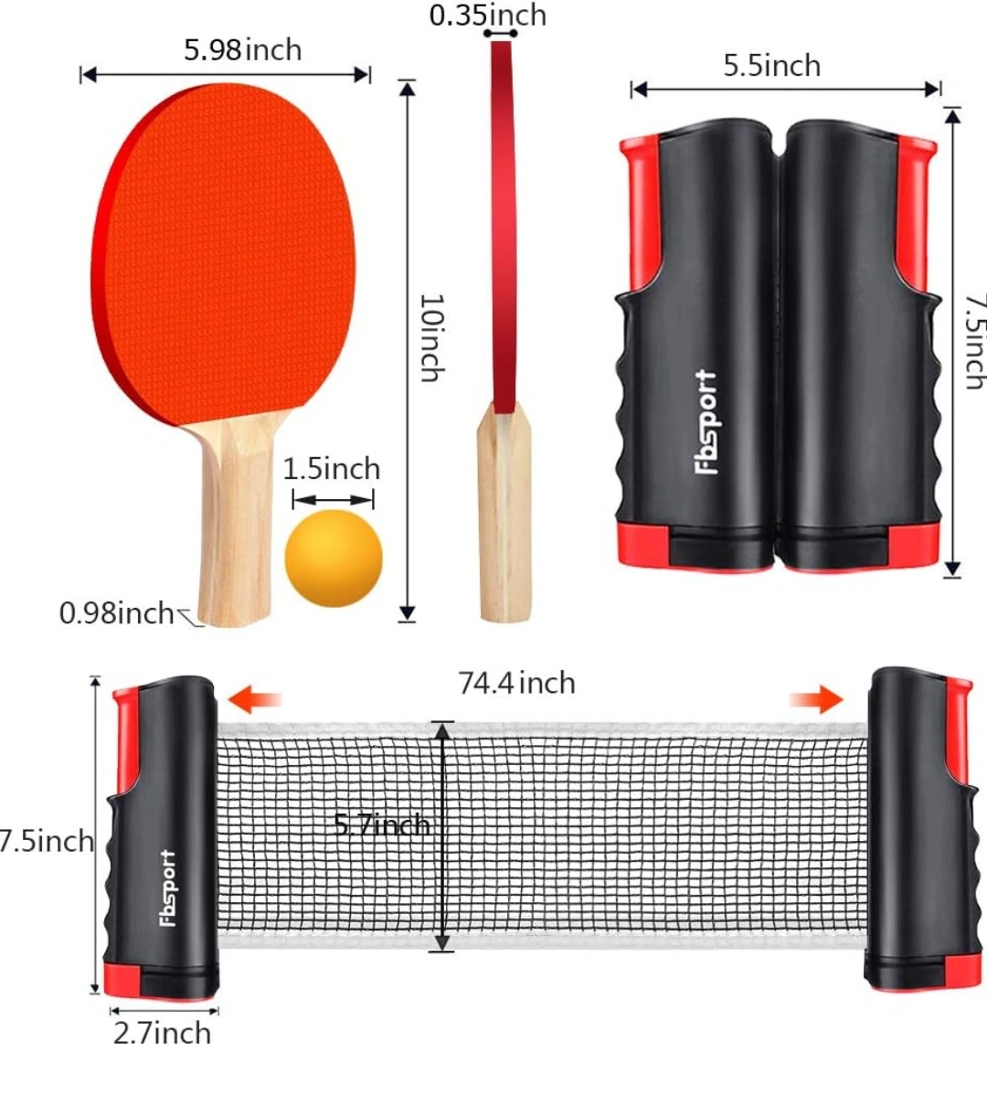 Four rackets, six ping pong balls, net and a carrying case. Great for family fun or casual play. In good condition.