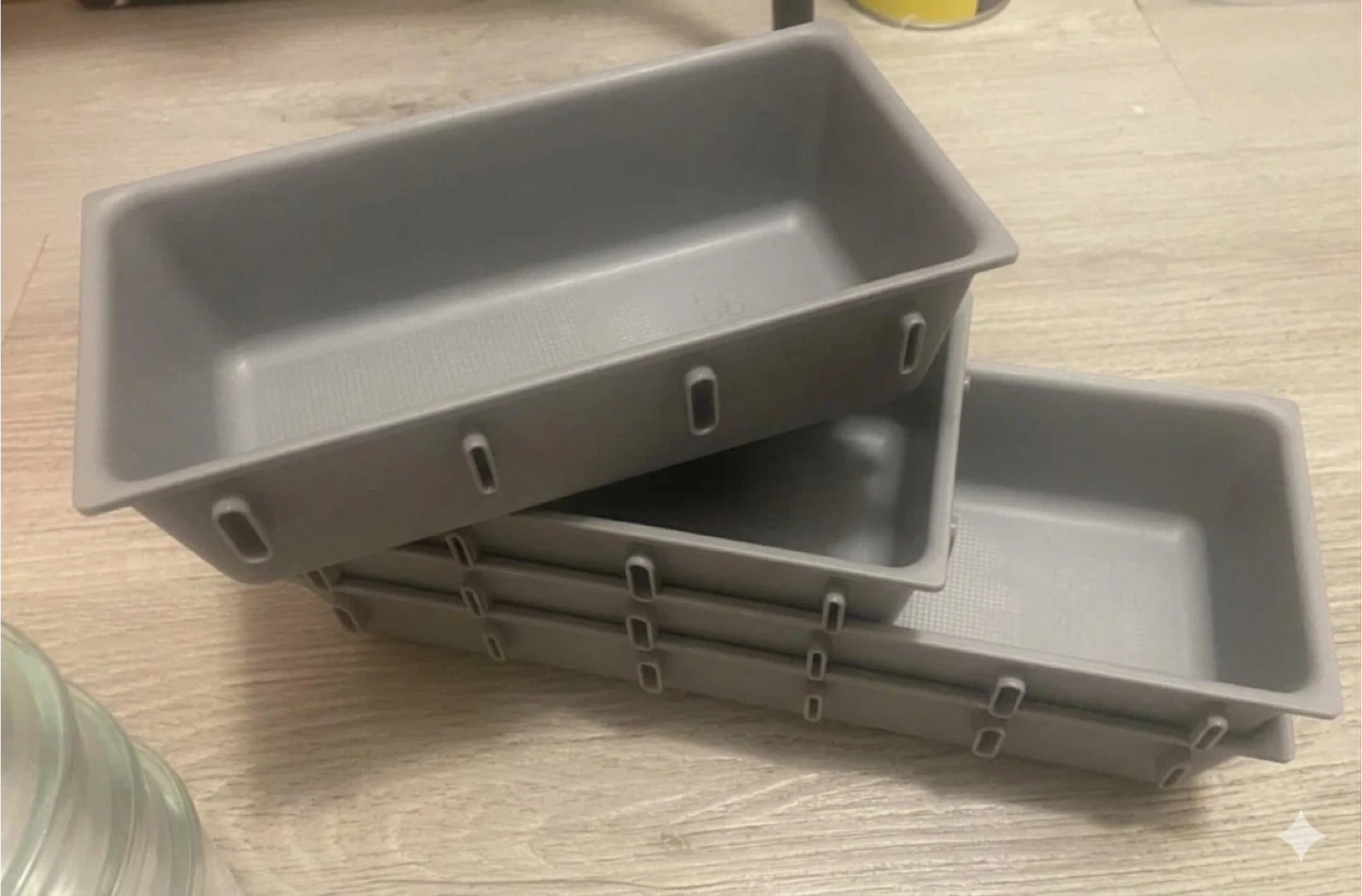 This is a set of 4 grey plastic storage bins. They're stackable and have rectangular openings on the sides for easy handling. Great for organizing small items in your home or workshop!
