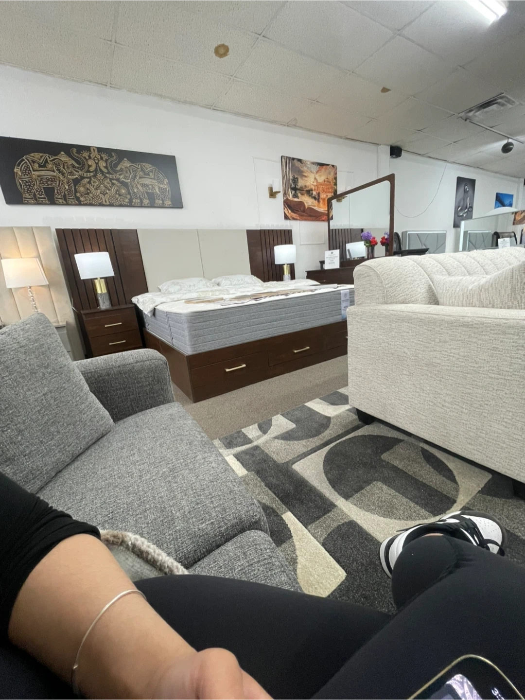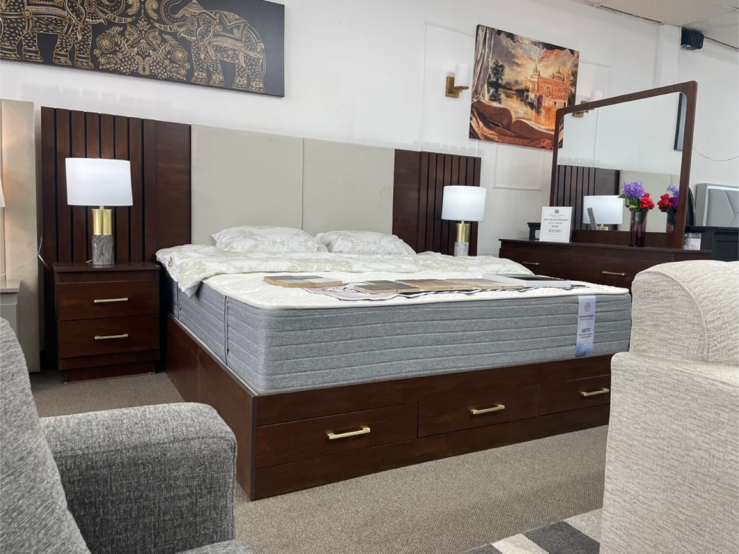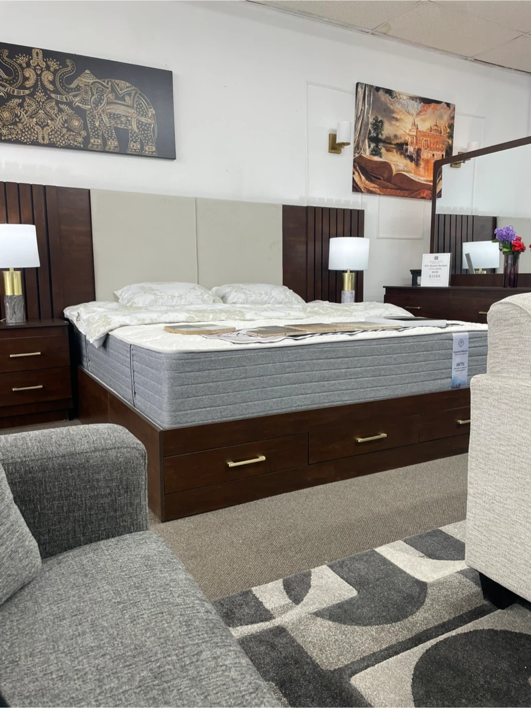 Comfortable queen size mattress featuring a grey quilted top. Comes with a dark wood bed frame that includes built-in storage drawers at the foot of the bed. Perfect for maximizing bedroom space!