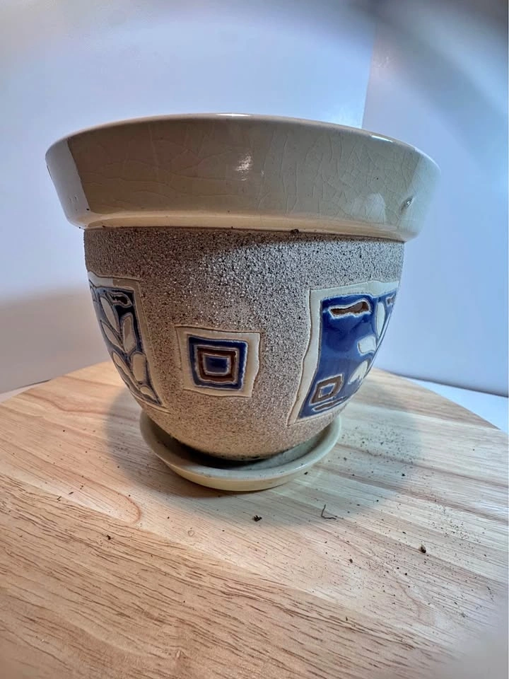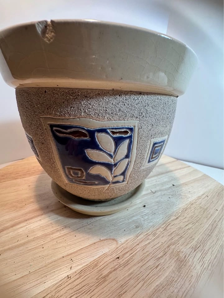 This is a decorative ceramic planter with a unique textured finish and blue glazed leaf design. It's made of ceramic with a textured, sandy finish on the body and a smooth, cream-colored rim. The design features a stylized blue leaf motif in a recessed panel, with small, square decorative accents on the sides. Please note there is a visible chip on the top rim, which is common in older, decorative pottery. It includes a matching ceramic saucer.
