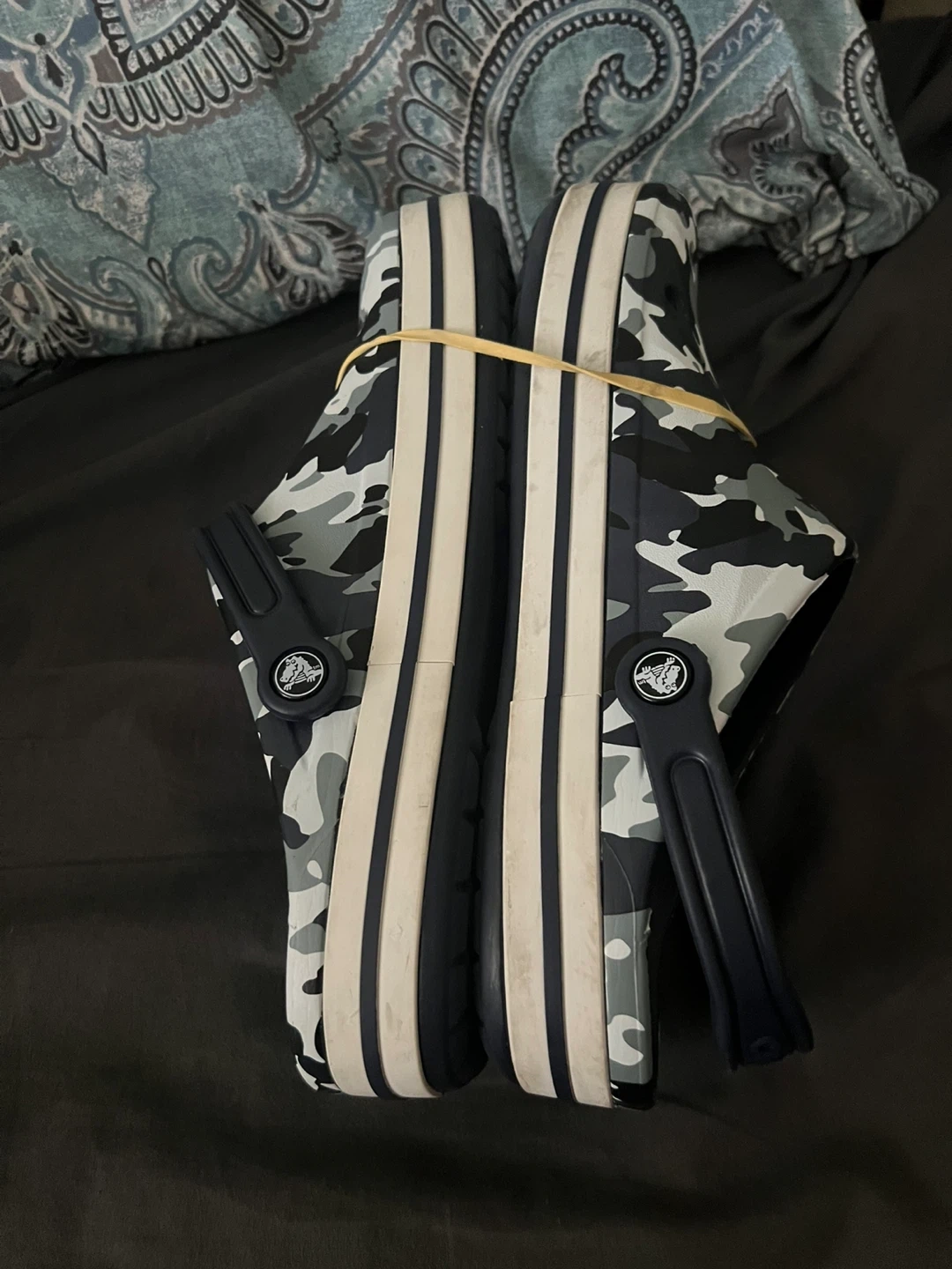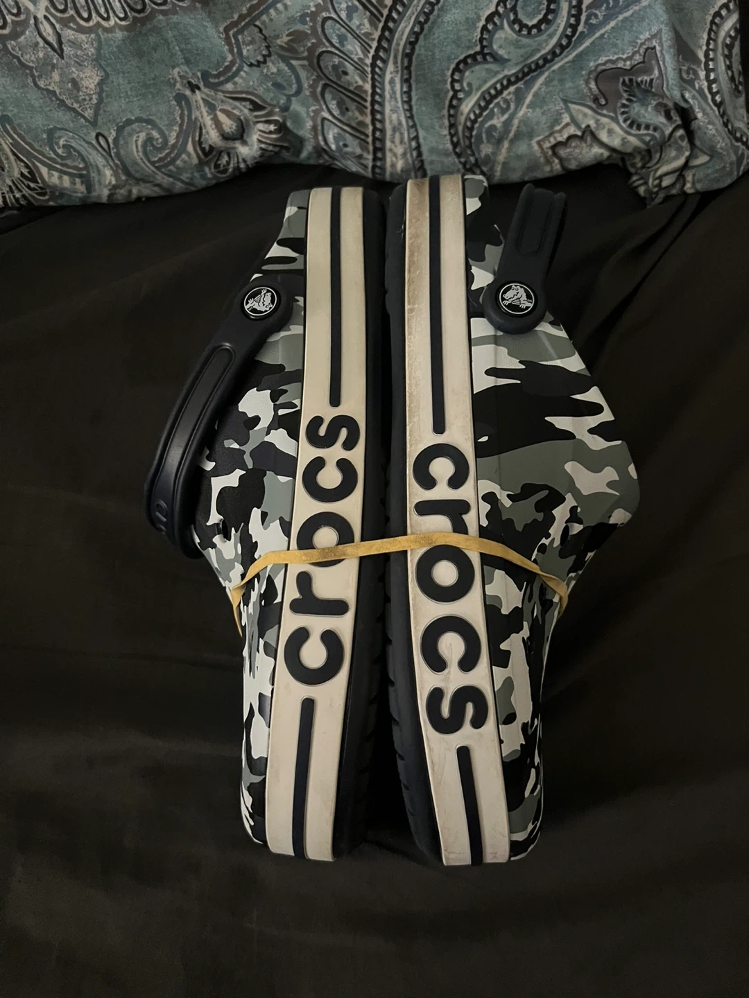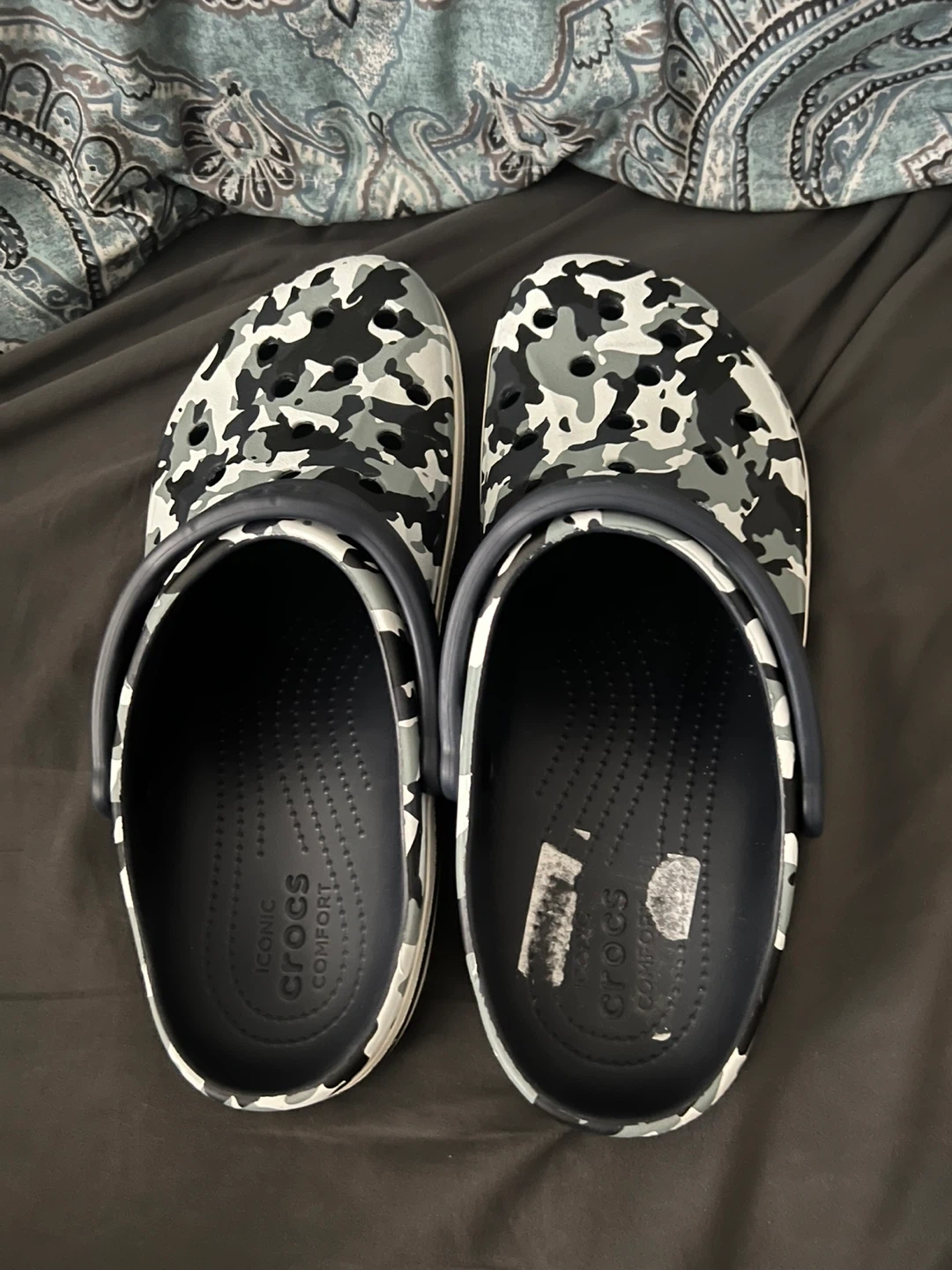 Selling a pair of Crocs clogs with a camo pattern. They are in good condition and ready for a new owner!
