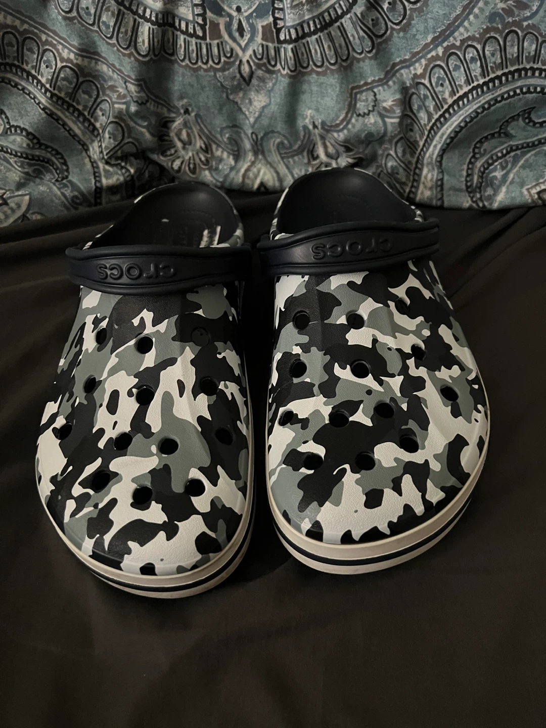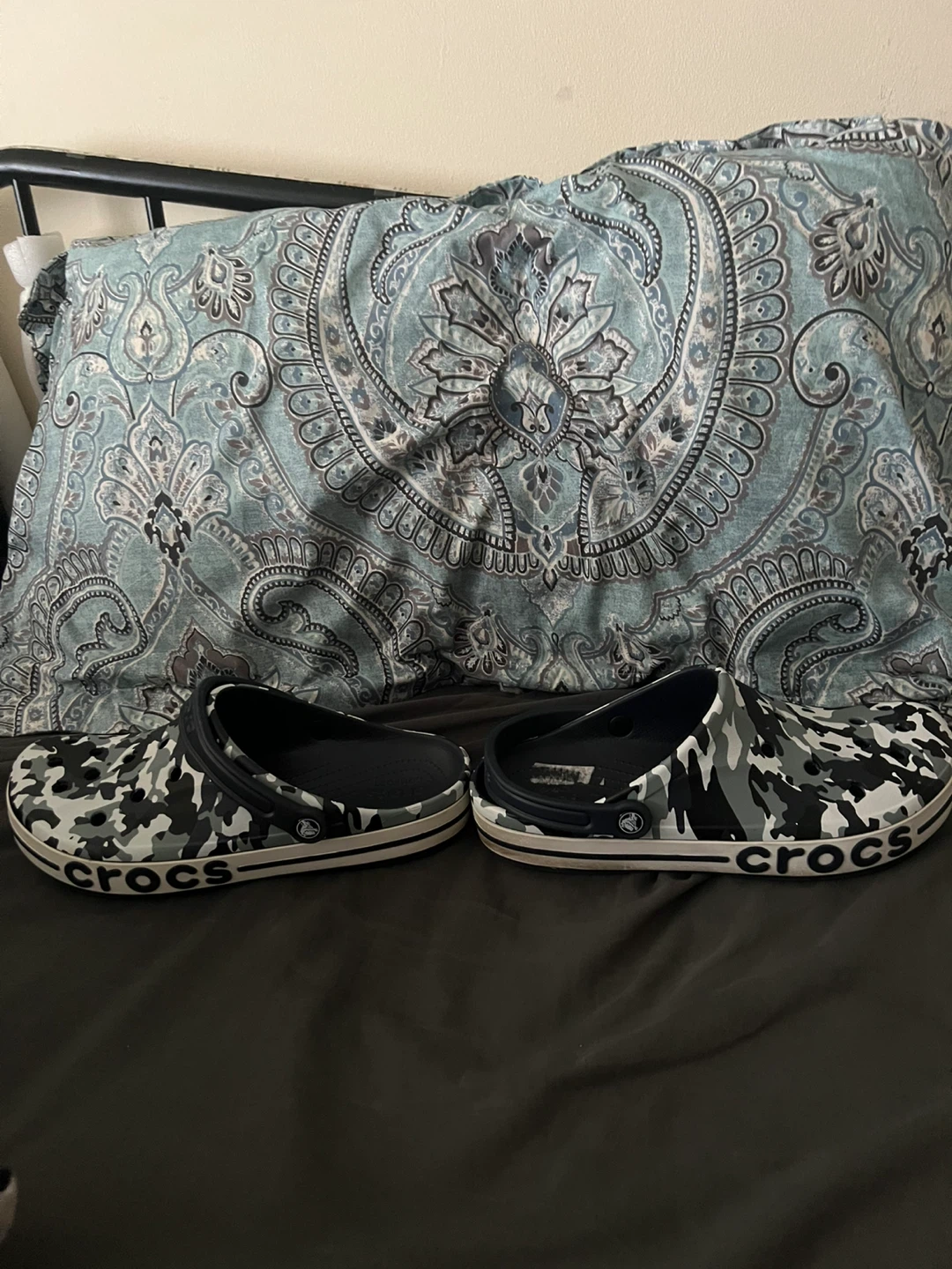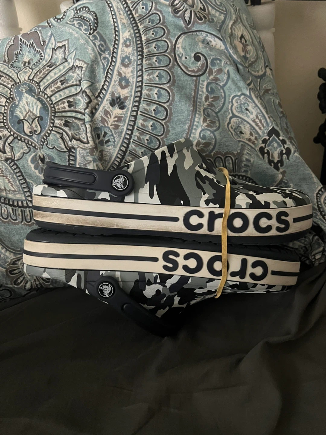 Selling a pair of Crocs clogs with a camo pattern. They are in good condition and ready for a new owner!