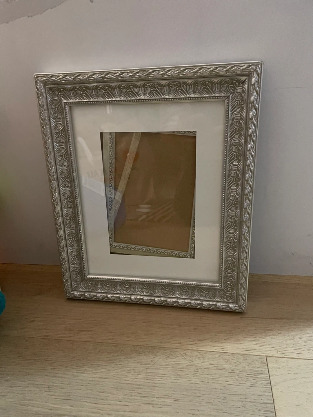 Decorative silver-toned picture frame with ornate detailing. It has a white mat insert. This frame's classic design makes it a lovely addition to any room.
