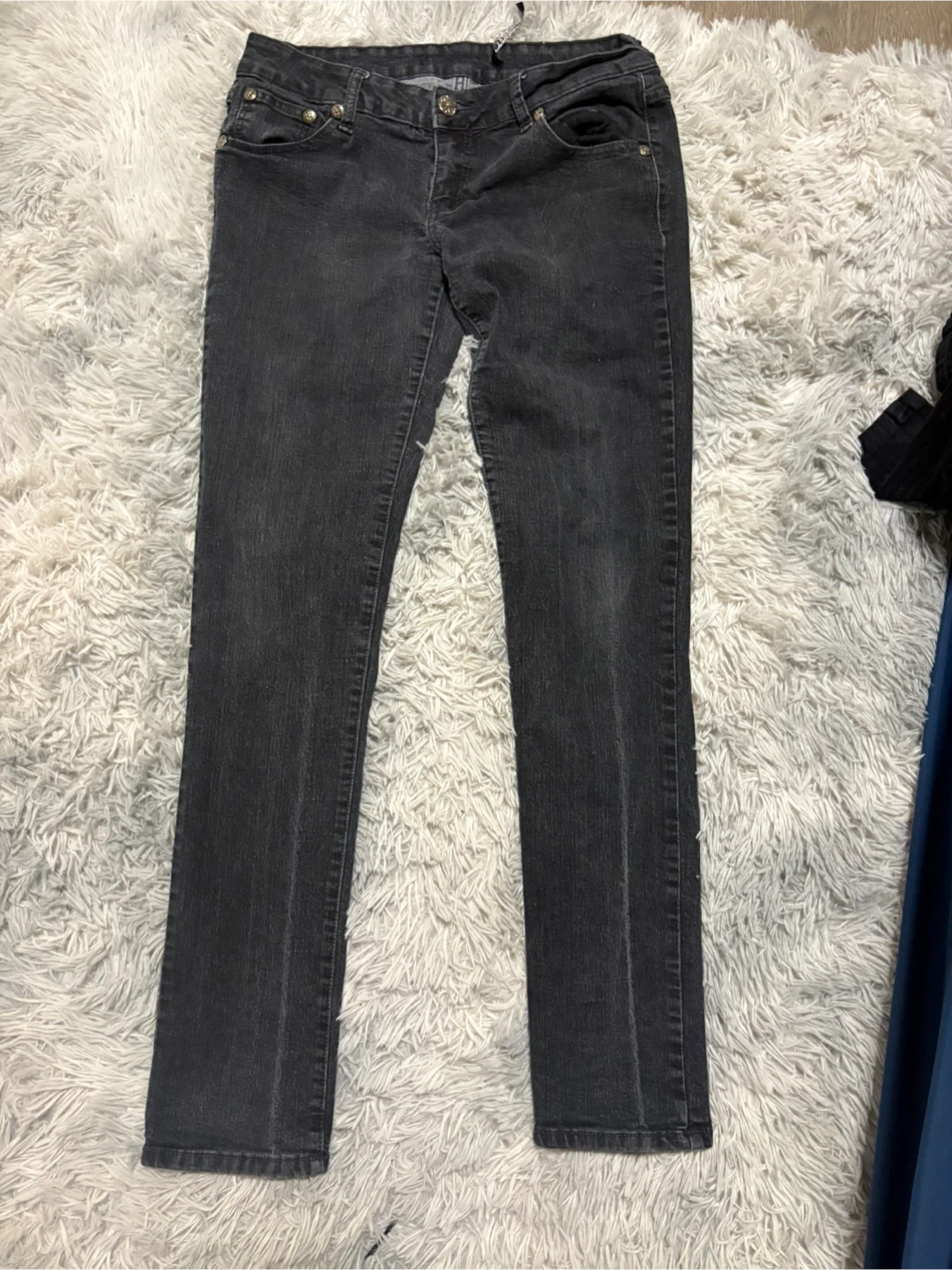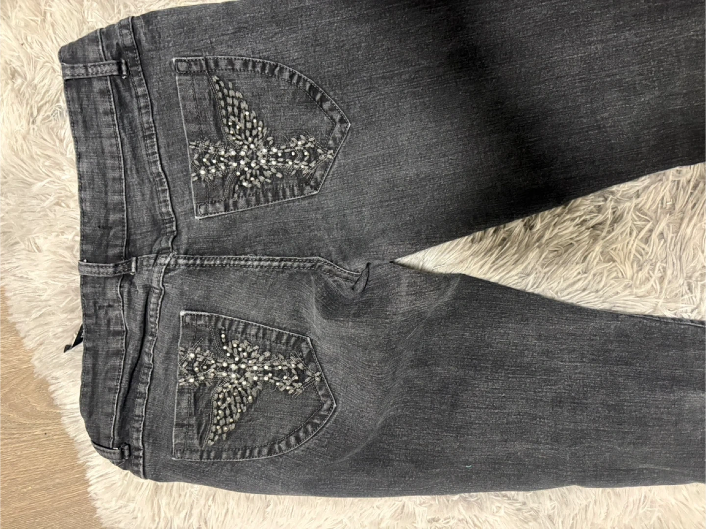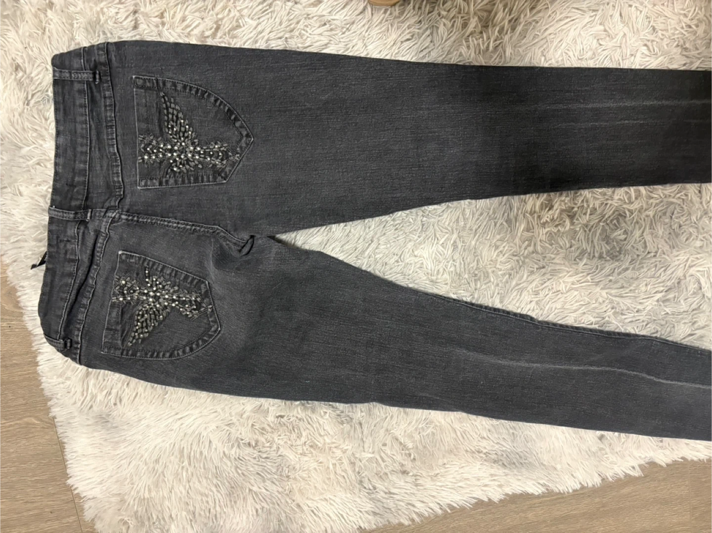 Dark wash jeans with embellished back pockets! These are a stylish addition to any wardrobe. The embellishments add a touch of sparkle and uniqueness. Size 7