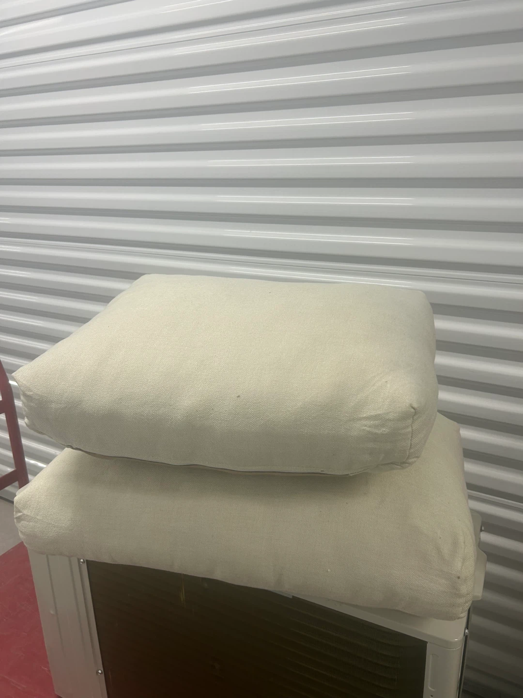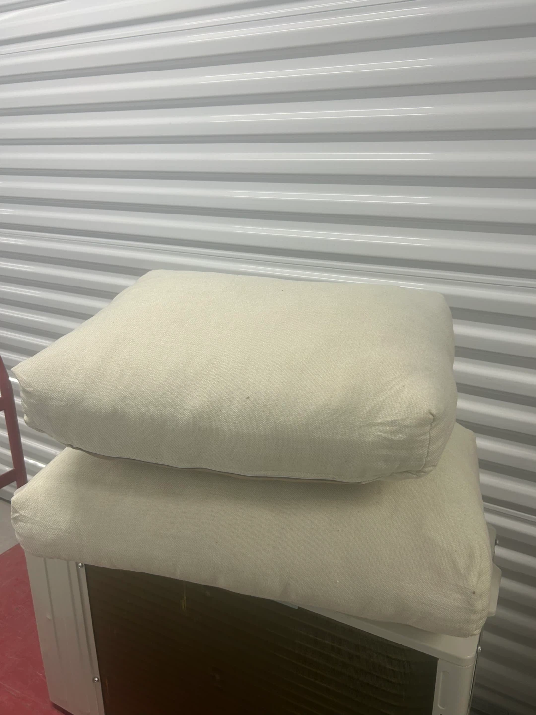 Two beige outdoor cushions. These have a durable fabric cover and a soft filling. They're suitable for patio chairs or benches. Measurements are approximately 20" x 20" x 5".