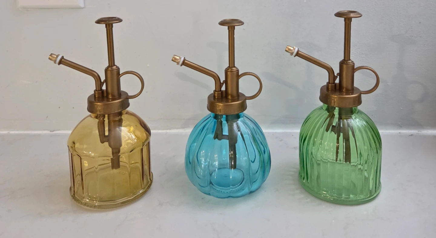 Set of three glass plant mister sprayers. Features a vintage-inspired brass pump and nozzle. Available in yellow, blue, and green colours.