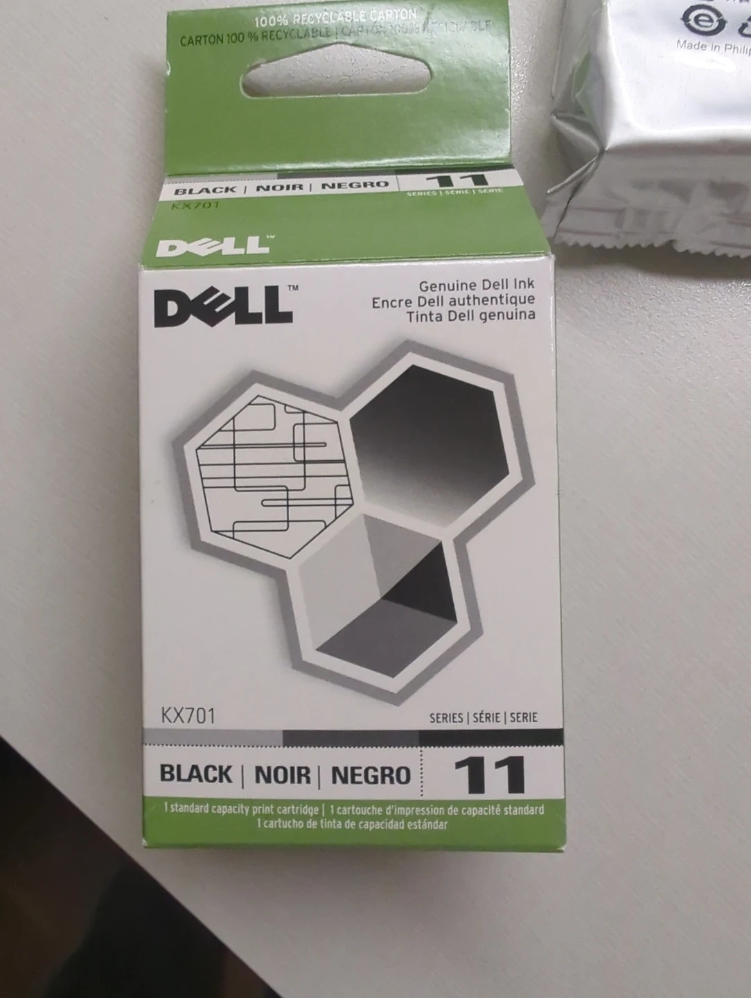 Genuine Dell Black ink cartridge, series 11, model KX701. It's a standard capacity print cartridge. Fits Dell printer models 948, V505, and V505w.