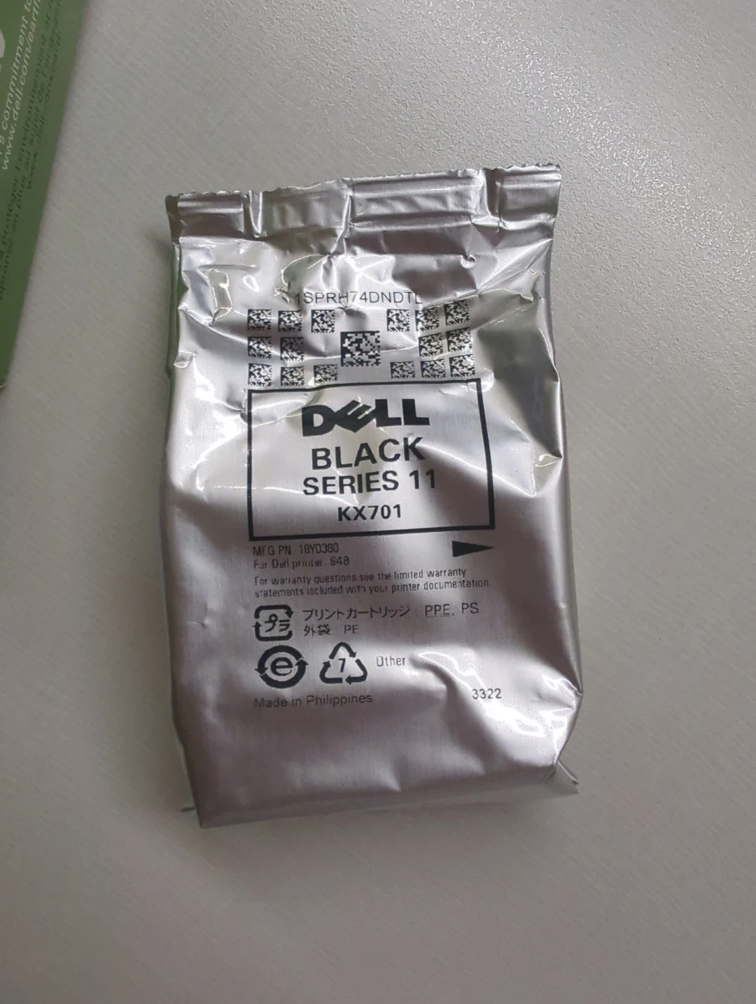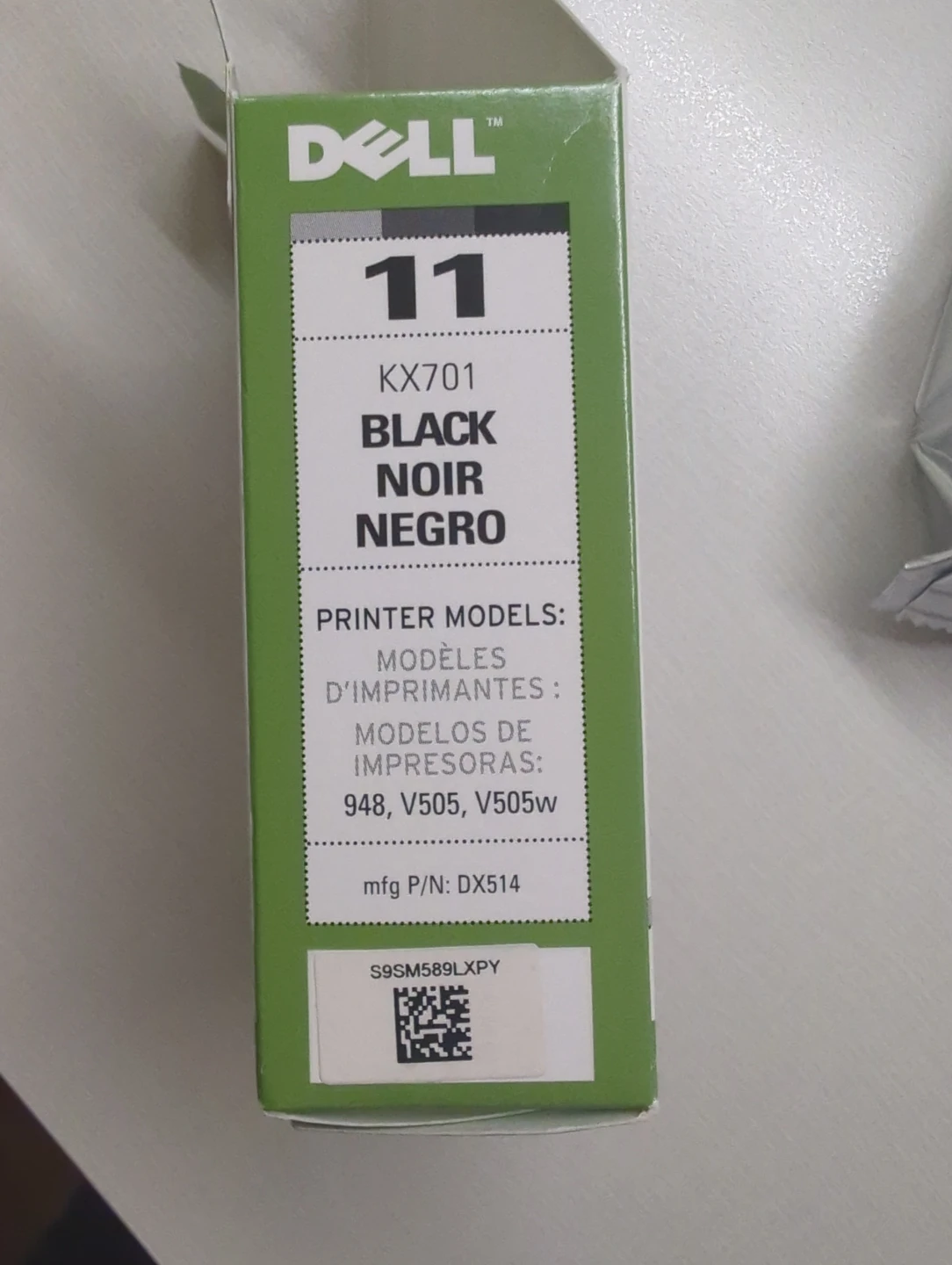 Genuine Dell Black ink cartridge, series 11, model KX701. It's a standard capacity print cartridge. Fits Dell printer models 948, V505, and V505w.