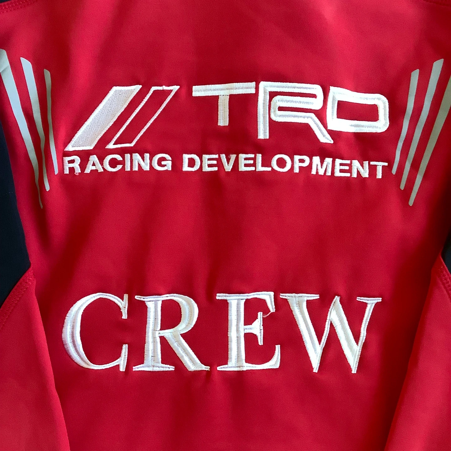 TRD Racing Development jacket features "TRD Racing Development" and "CREW" embroidered on the back. It also has "TOYOTA" across the front. It's a great jacket for any Toyota enthusiast! Issued for the team crew.
