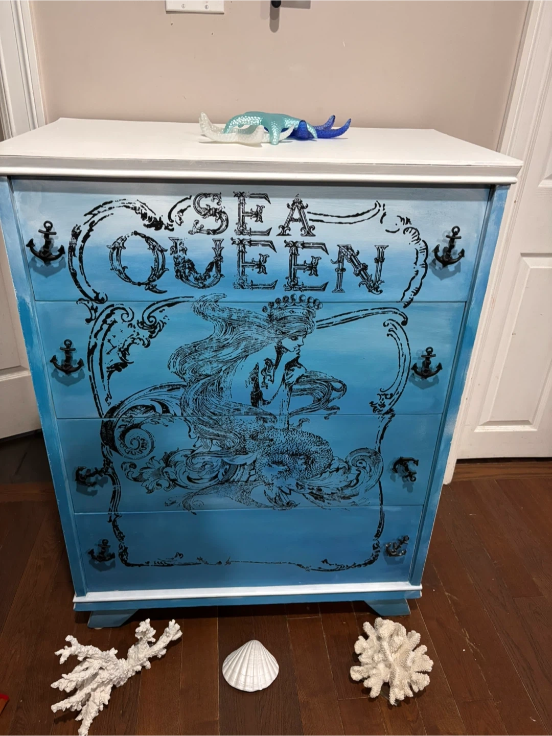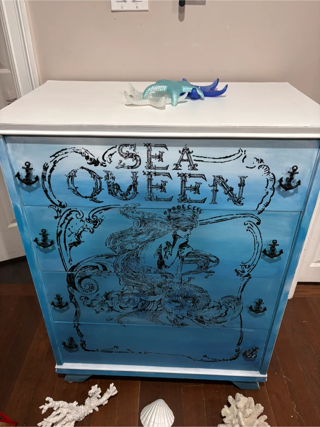 🏆This dresser features a 'Sea Queen' design with a mermaid graphic and anchor accents. It's a beautiful piece for a coastal-themed room. The dresser has multiple drawers for storage.