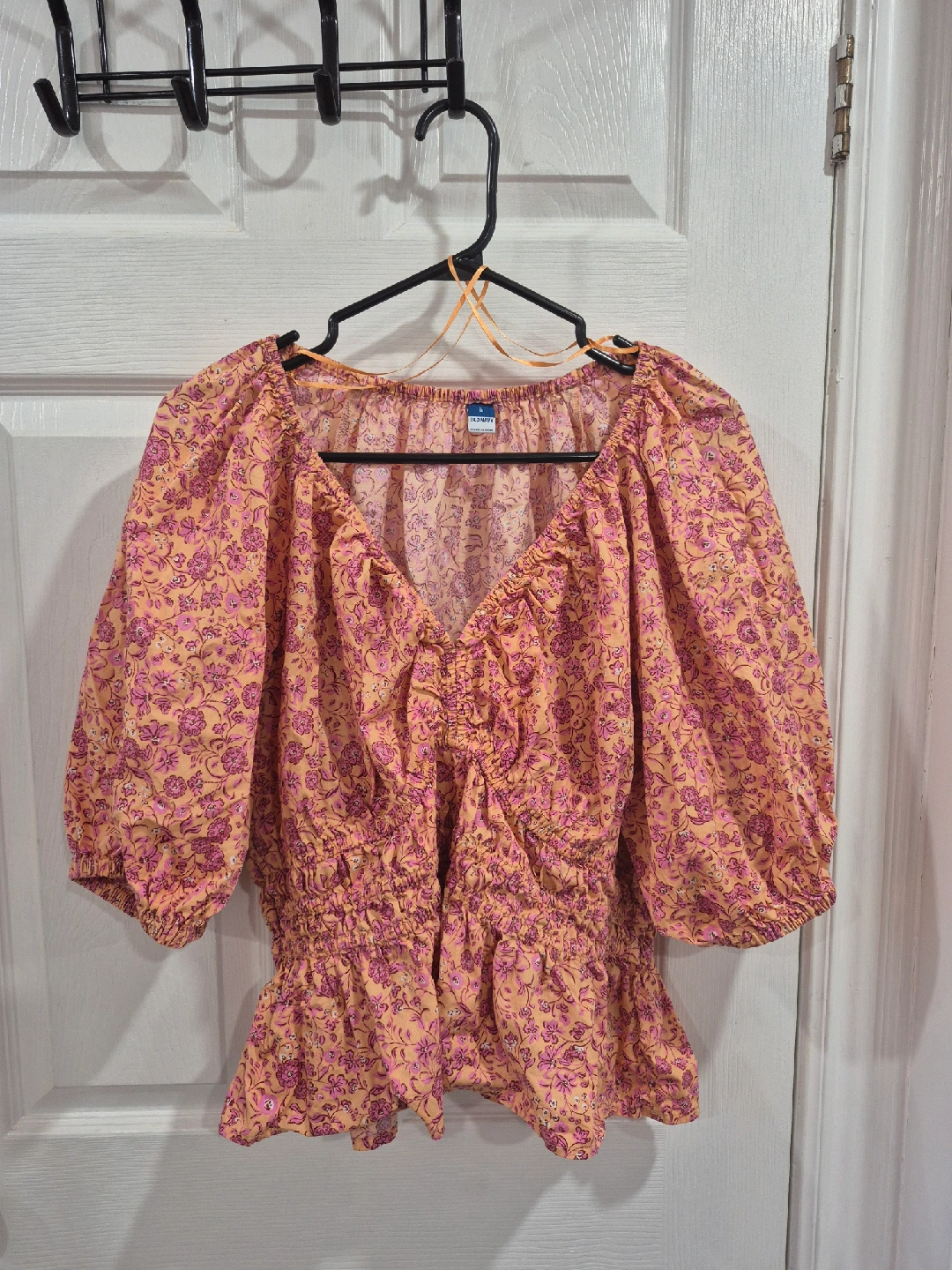 This Old Navy blouse is so cute! It features a peach and pink floral pattern, a v-neck, and puffy sleeves.