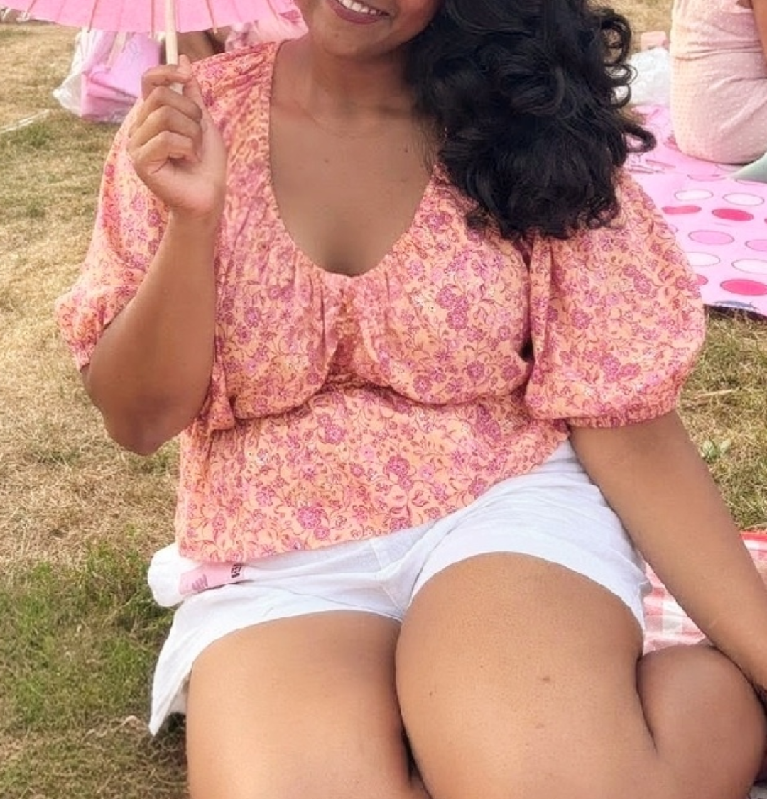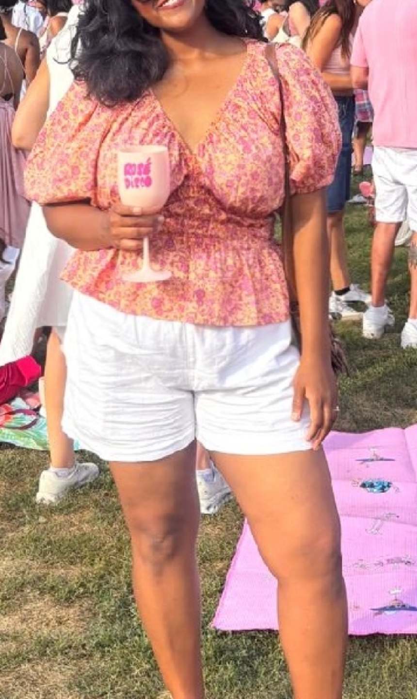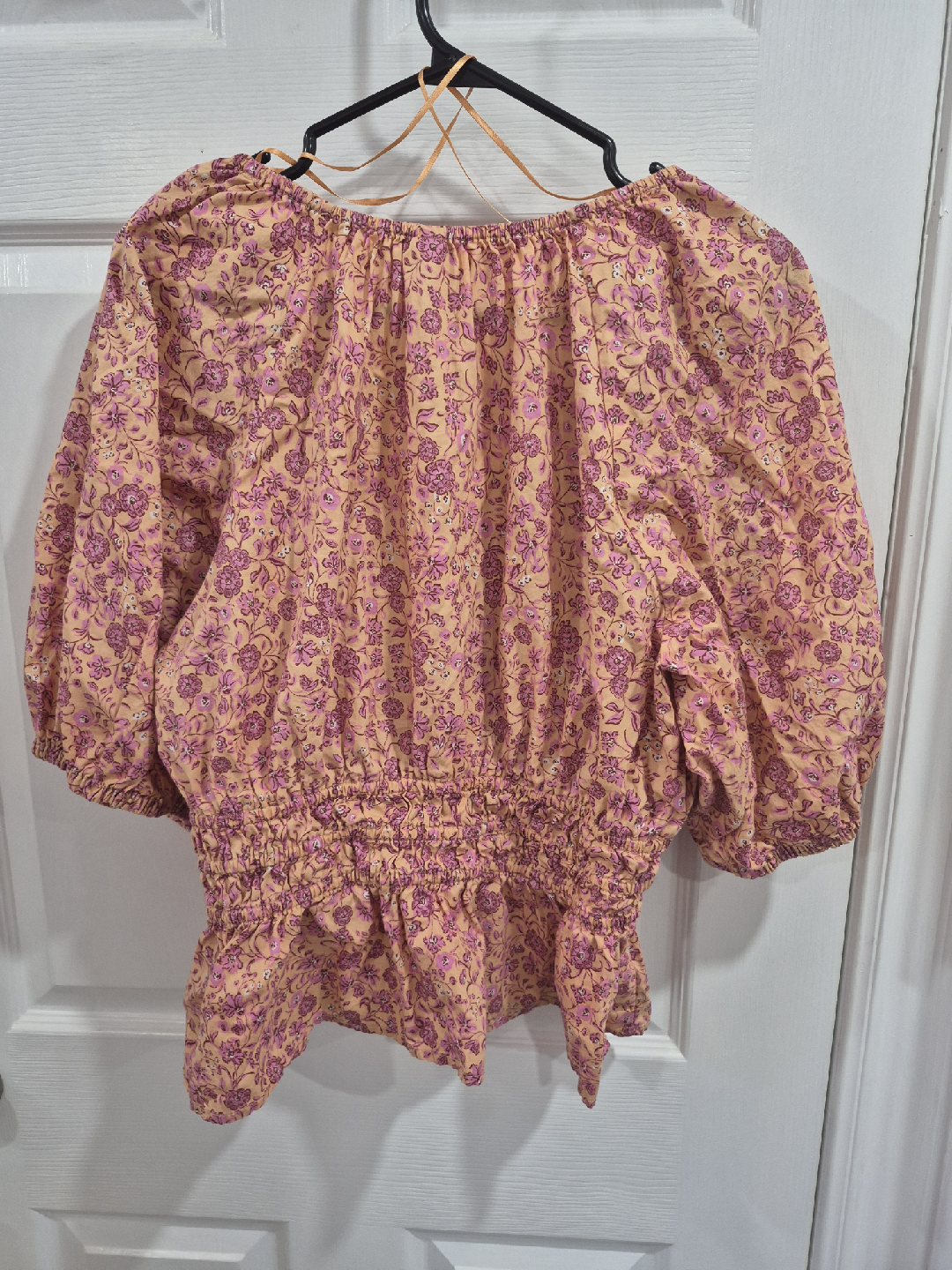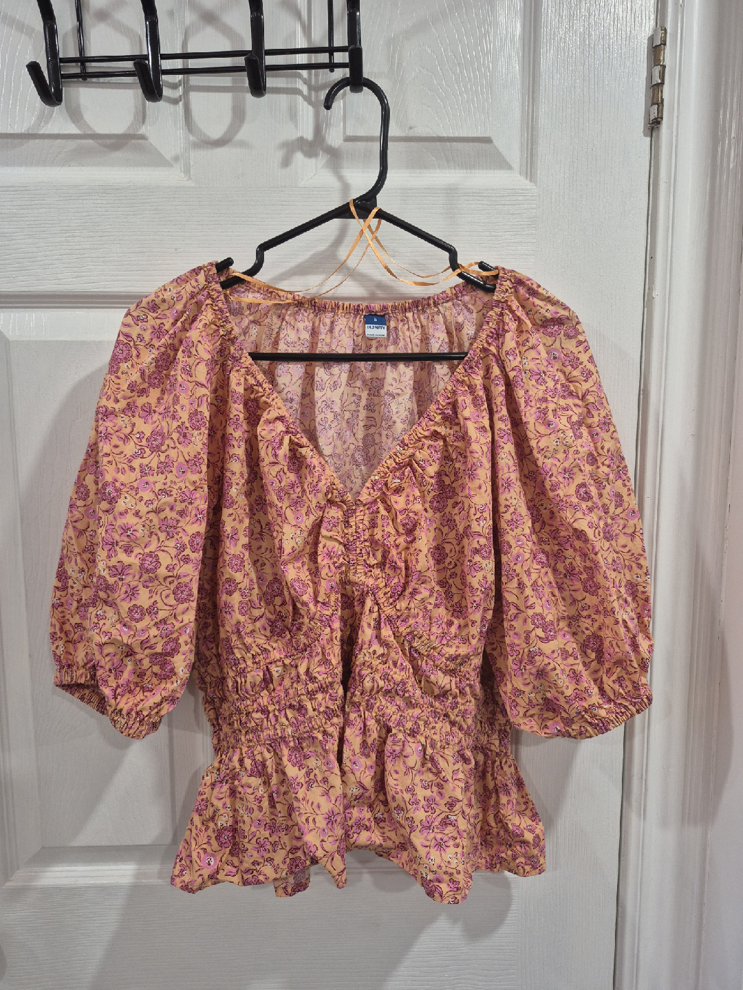 This Old Navy blouse is so cute! It features a peach and pink floral pattern, a v-neck, and puffy sleeves.